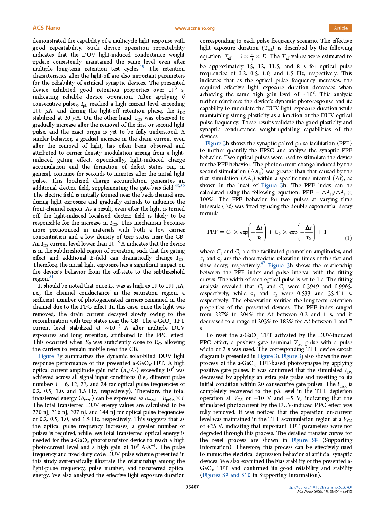 Figure 3. (a−d) Solar-blind DUV photoresponse in linear and logarithmic scales at different light-pulse frequencies of 0.2, 0.5, 1.0, and 1.5 Hz for a-GaOx-TFTs. The inset shows the pulse scheme of the measurement. (e) Retention characteristics for different numbers of DUV-light-pulse inputs (1−6 pulses) with a 0.2 Hz square-wave. For comparison, the dark current is shown as background noise. (f) Number of DUV pulse input dependency of the photoresponse in the linear (top) and logarithmic (bottom) scales. (g) Dynamic photocurrent amplitude gain ratio over 108 and total transferred DUV optical energy as a function of light-pulse frequency. (h) PPF index as a function of the interval time (Δt). The circles and lines represent the experimental values and fitting curves, respectively. The inset presents ΔIph stimulated by two consecutive optical pulses (pulse duration is 1 s, and Δt is 2 s). (i) Device circuit diagram for the PPC reset process by positive gate-terminal pulses and (j) variation in IDS by positive gate-terminal pulse inputs to reset the stimulated state to the initial state. IDS as a function of time was recorded at different VGS values of 25, −5, and −10 V. The inset shows the positive gate pulse schemes.