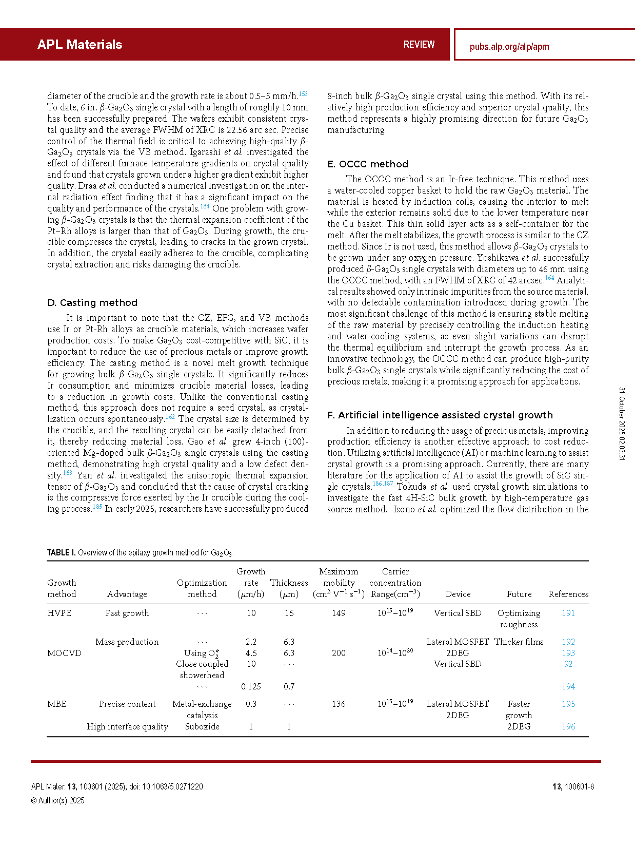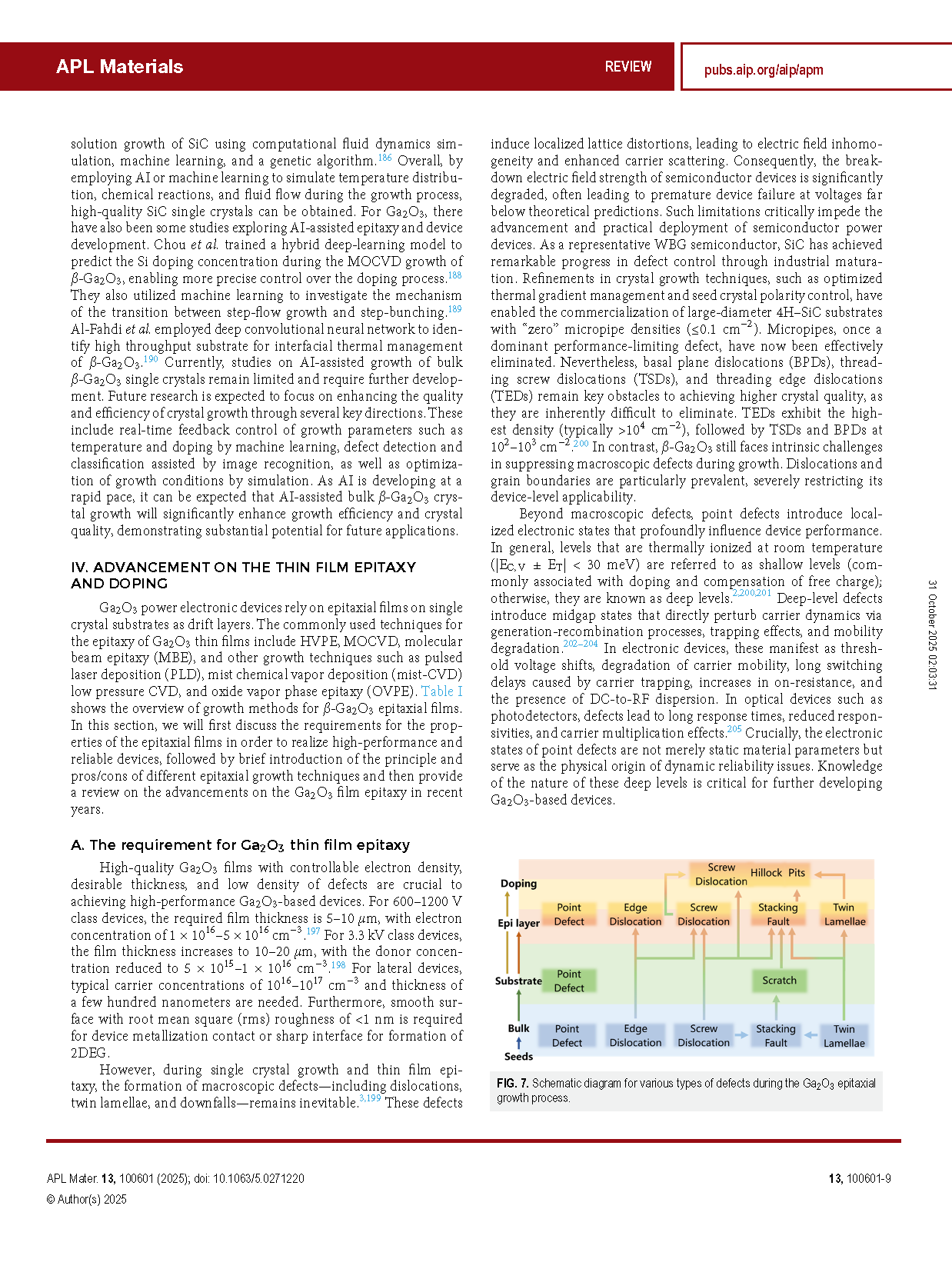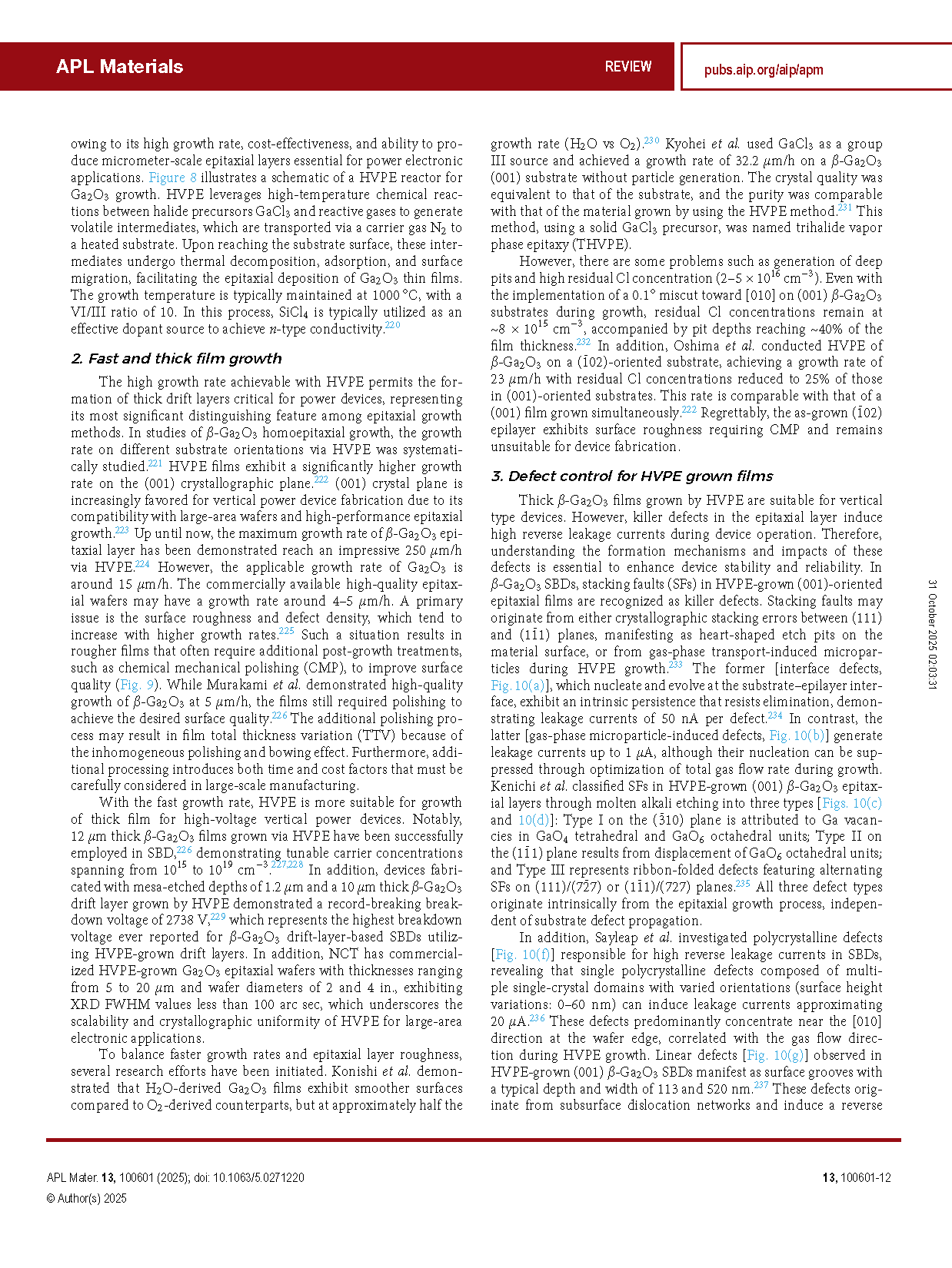 Over the past few years, substantial progress has been achieved in bulk crystal substrate development. The EFG method has enabled the production of large-diameter β-Ga2O3 wafers up to 6 in., with dislocation densities as low as 104 cm−2. In addition, other growth methods such as CZ, VB, and casting have been increasingly explored. For instance, 8 in. bulk crystals have been synthesized using the casting method, while 6 and 2 in. crystals have been produced using VB and CZ, respectively. The 6 in. substrate and epitaxial wafer are expected to be the standard size for mass production in foundries. To make Ga2O3 competitive with SiC, it is crucial to further reduce substrate costs, ideally achieving a 6 in. substrate for $400. Moreover, defect densities in substrates remain relatively high, necessitating further fundamental studies and the development of non-destructive defect inspection techniques.