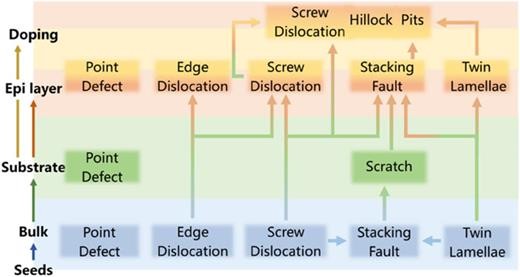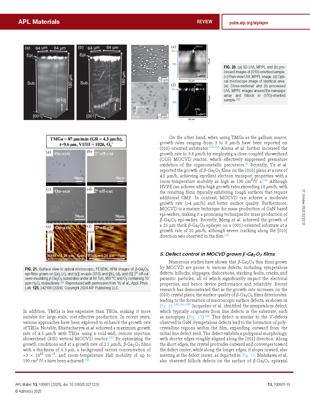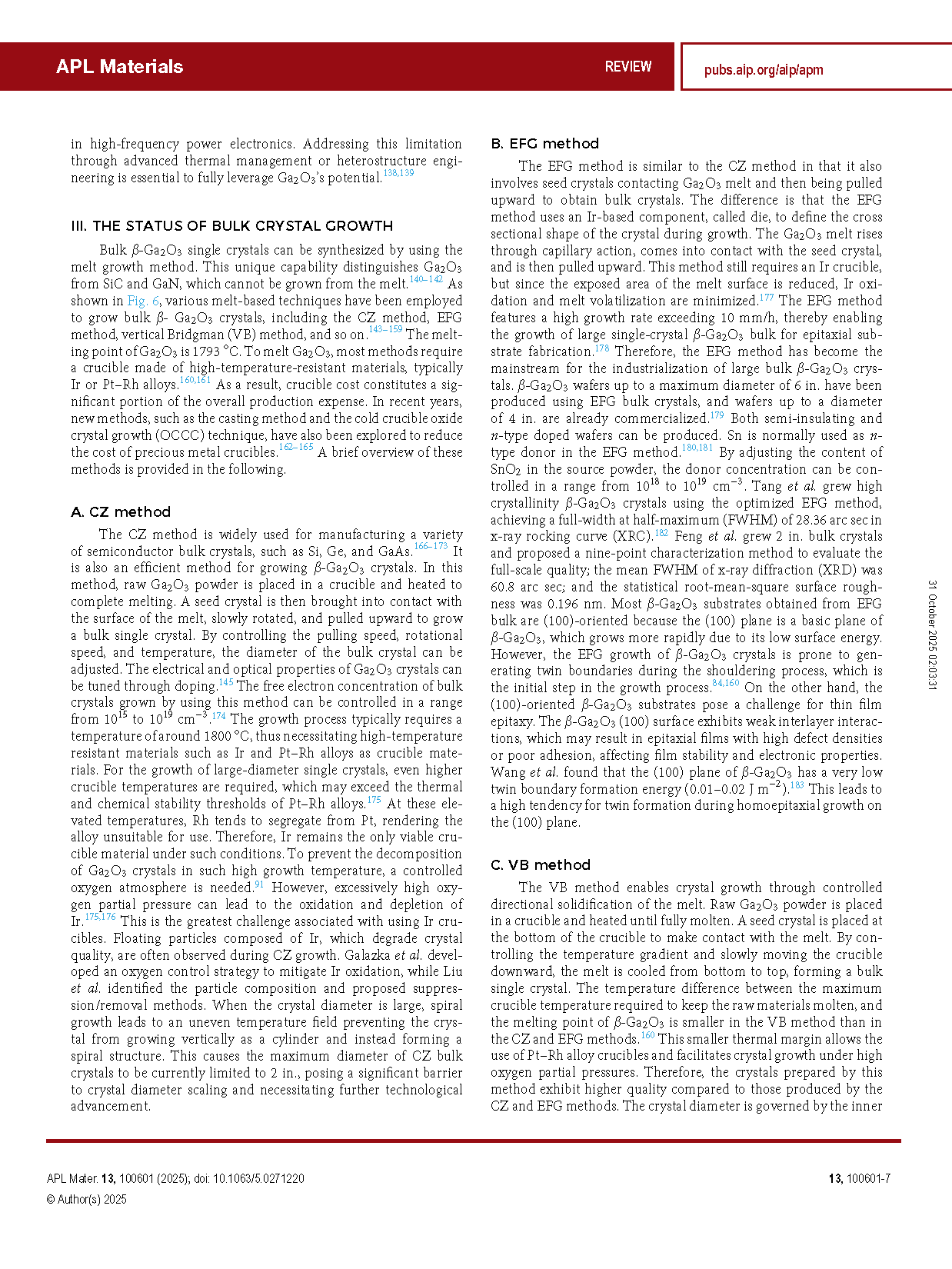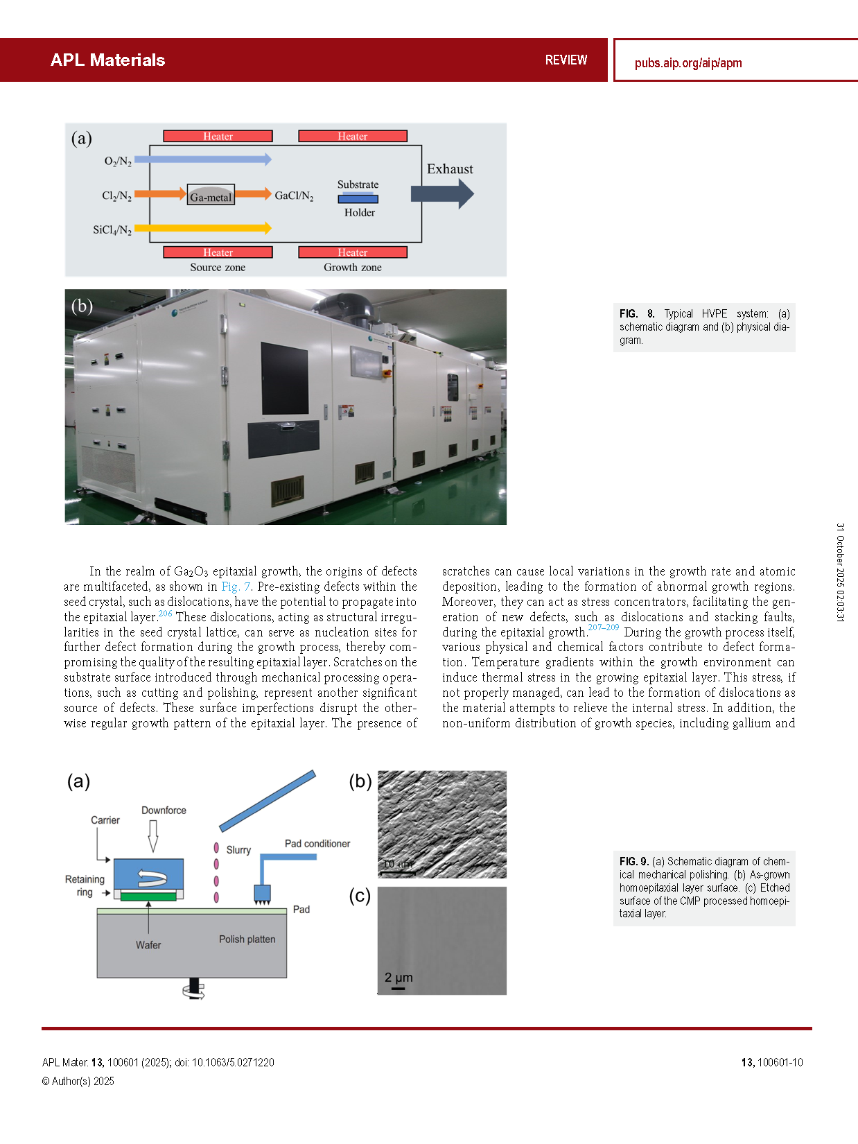 Over the past few years, substantial progress has been achieved in bulk crystal substrate development. The EFG method has enabled the production of large-diameter β-Ga2O3 wafers up to 6 in., with dislocation densities as low as 104 cm−2. In addition, other growth methods such as CZ, VB, and casting have been increasingly explored. For instance, 8 in. bulk crystals have been synthesized using the casting method, while 6 and 2 in. crystals have been produced using VB and CZ, respectively. The 6 in. substrate and epitaxial wafer are expected to be the standard size for mass production in foundries. To make Ga2O3 competitive with SiC, it is crucial to further reduce substrate costs, ideally achieving a 6 in. substrate for $400. Moreover, defect densities in substrates remain relatively high, necessitating further fundamental studies and the development of non-destructive defect inspection techniques.
