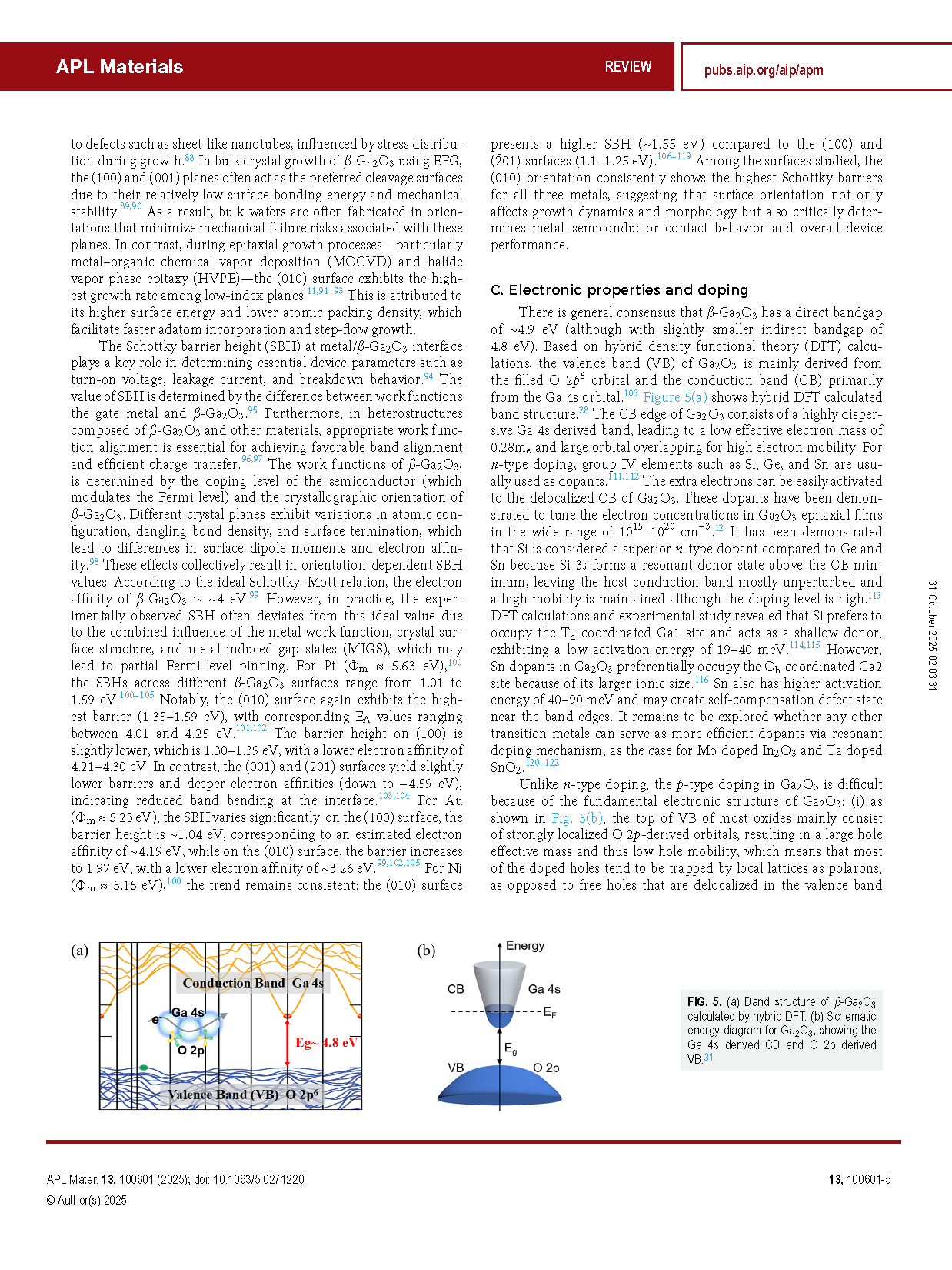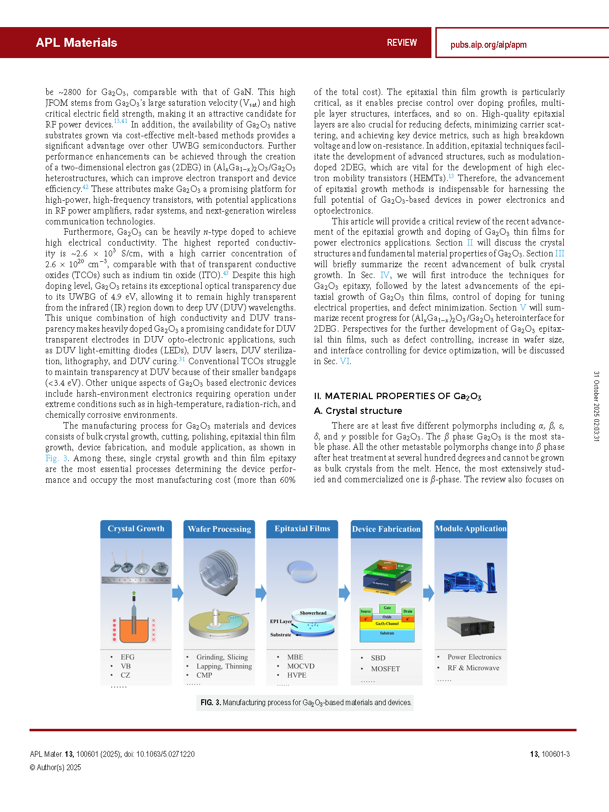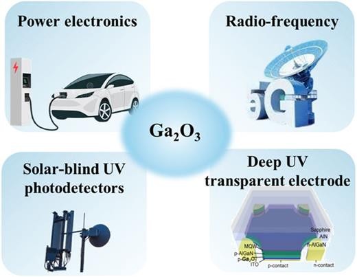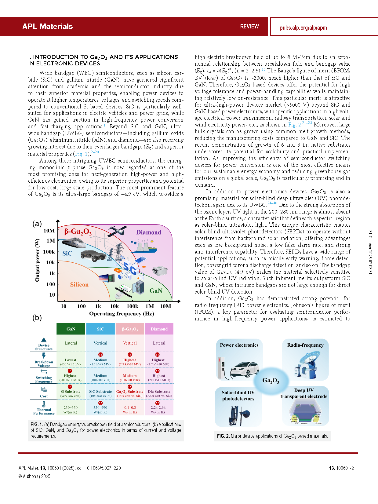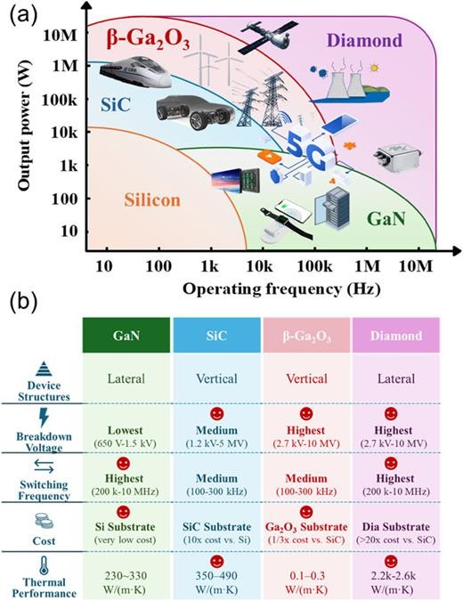 Wide bandgap (WBG) semiconductors, such as silicon carbide (SiC) and gallium nitride (GaN), have garnered significant attention from academia and the semiconductor industry due to their superior material properties, enabling power devices to operate at higher temperatures, voltages, and switching speeds compared to conventional Si-based devices. SiC is particularly well-suited for applications in electric vehicles and power grids, while GaN has gained traction in high-frequency power conversion and fast-charging applications.1 Beyond SiC and GaN, ultra-wide bandgap (UWBG) semiconductors—including gallium oxide (Ga2O3), aluminum nitride (AlN), and diamond—are also receiving growing interest due to their even larger bandgaps (Eg) and superior material properties. Among those intriguing UWBG semiconductors, the emerging monoclinic β-phase Ga2O3 is now regarded as one of the most promising ones for next-generation high-power and high-efficiency electronics, owing to its superior properties and potential for low-cost, large-scale production. The most prominent feature of Ga2O3 is its ultra-large bandgap of ∼4.9 eV, which provides a high electric breakdown field of up to 8 MV/cm due to an exponential relationship between breakdown field and bandgap value (Eg), εc = a(Eg)n, (n = 2–2.5).