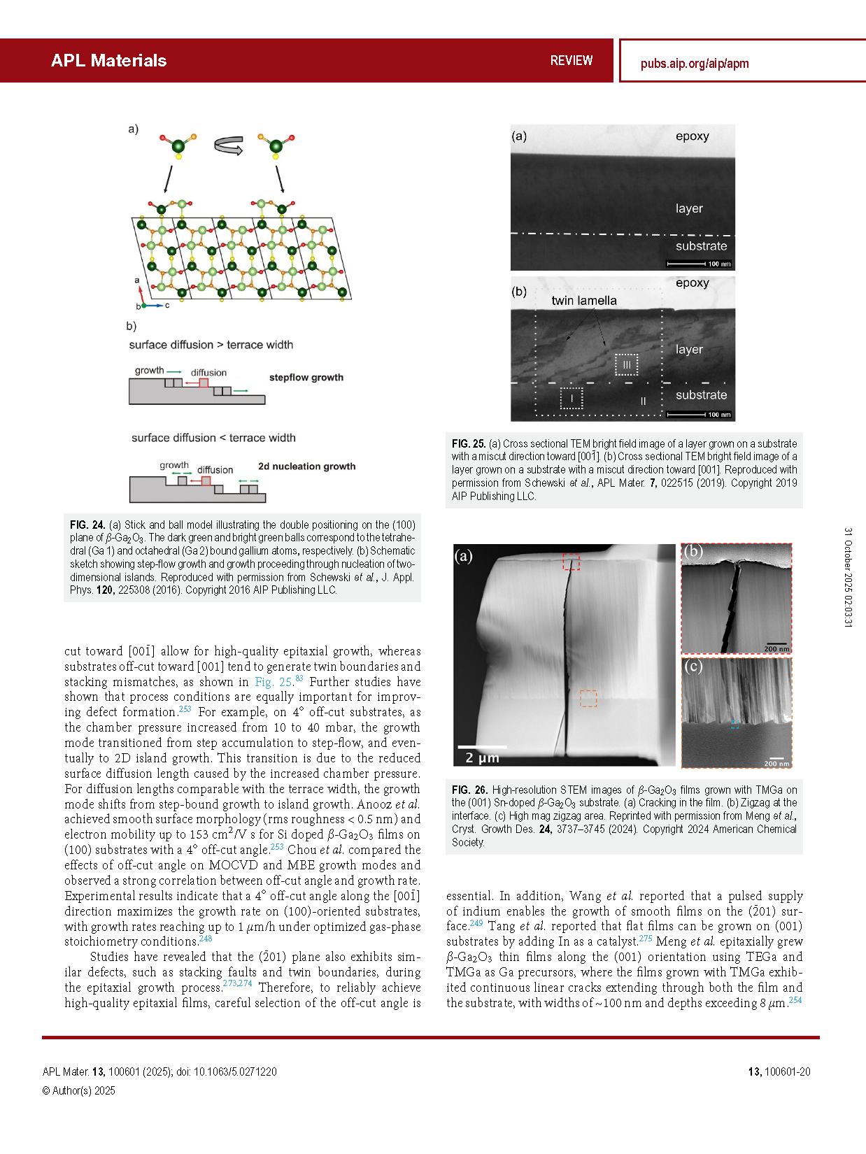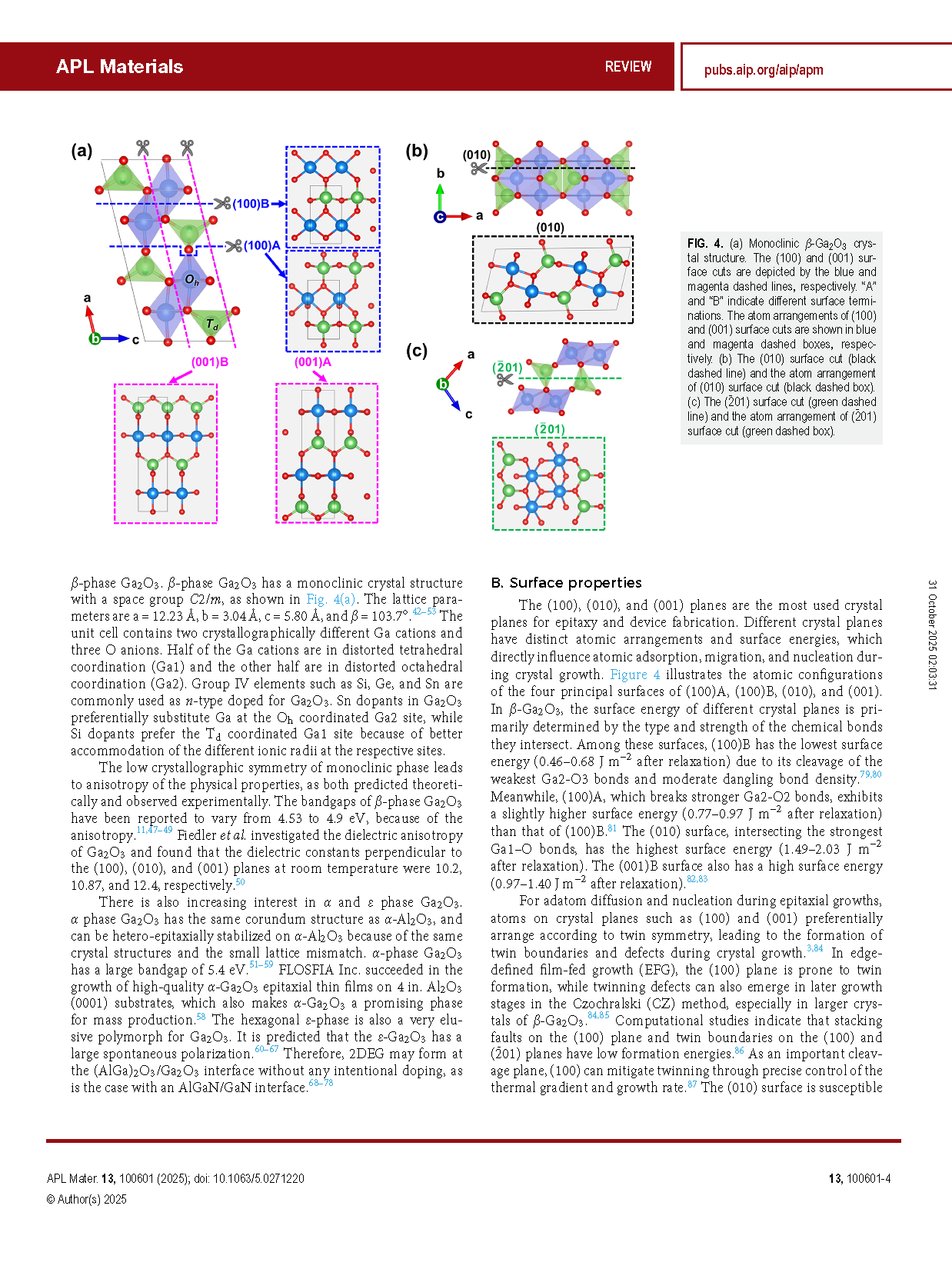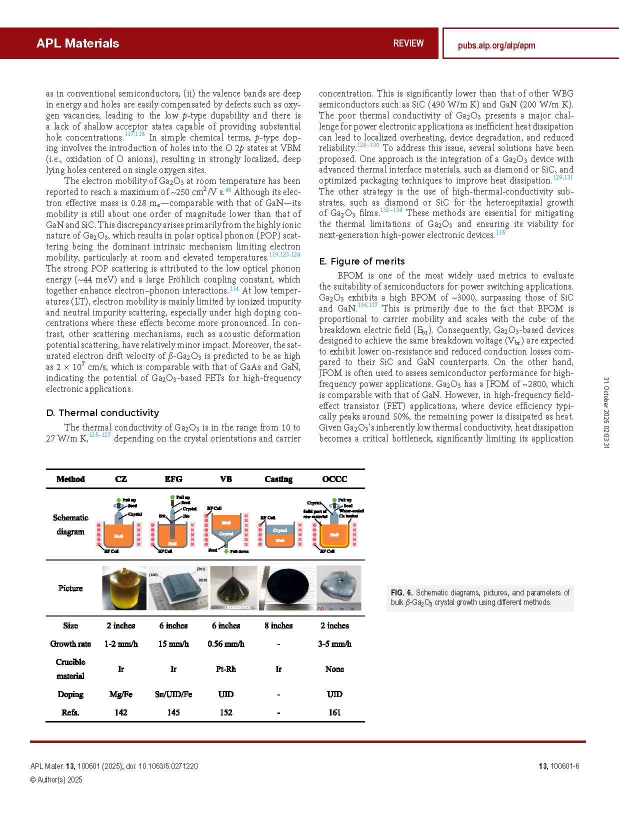Wide bandgap (WBG) semiconductors, such as silicon carbide (SiC) and gallium nitride (GaN), have garnered significant attention from academia and the semiconductor industry due to their superior material properties, enabling power devices to operate at higher temperatures, voltages, and switching speeds compared to conventional Si-based devices. SiC is particularly well-suited for applications in electric vehicles and power grids, while GaN has gained traction in high-frequency power conversion and fast-charging applications.1 Beyond SiC and GaN, ultra-wide bandgap (UWBG) semiconductors—including gallium oxide (Ga2O3), aluminum nitride (AlN), and diamond—are also receiving growing interest due to their even larger bandgaps (Eg) and superior material properties. Among those intriguing UWBG semiconductors, the emerging monoclinic β-phase Ga2O3 is now regarded as one of the most promising ones for next-generation high-power and high-efficiency electronics, owing to its superior properties and potential for low-cost, large-scale production. The most prominent feature of Ga2O3 is its ultra-large bandgap of ∼4.9 eV, which provides a high electric breakdown field of up to 8 MV/cm due to an exponential relationship between breakdown field and bandgap value (Eg), εc = a(Eg)n, (n = 2–2.5).