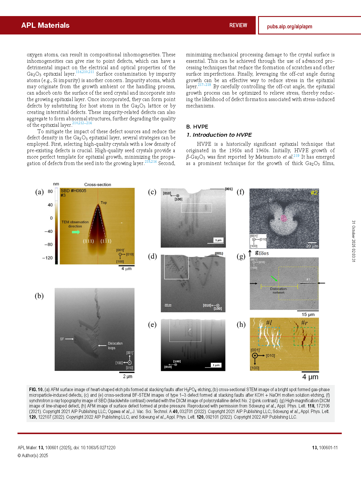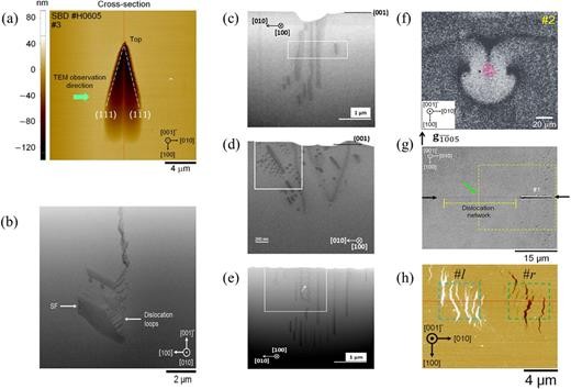 FIG. 10. (a) AFM surface image of heart-shaped etch pits formed at stacking faults after H3PO4 etching; (b) cross-sectional STEM image of a bright spot formed gas-phase microparticle-induced defects; (c) and (e) cross-sectional BF-STEM images of type 1–3 defect formed at stacking faults after KOH + NaOH molten solution etching; (f) synchrotron x-ray topography image of SBD (black/white contrast) overlaid with the DICM image of polycrystalline defect No. 2 (pink contrast). (g) High-magnification DICM image of line-shaped defect; (h) AFM image of surface defect formed at probe pressure. Reproduced with permission from Sdoeung et al., Appl. Phys. Lett. 118, 172106 (2021). Copyright 2021 AIP Publishing LLC; Ogawa et al., J. Vac. Sci. Technol. A 40, 032701 (2022). Copyright 2021 AIP Publishing LLC; Sdoeung et al., Appl. Phys. Lett. 120, 122107 (2022). Copyright 2022 AIP Publishing LLC; and Sdoeung et al., Appl. Phys. Lett. 120, 092101 (2022). Copyright 2022 AIP Publishing LLC.