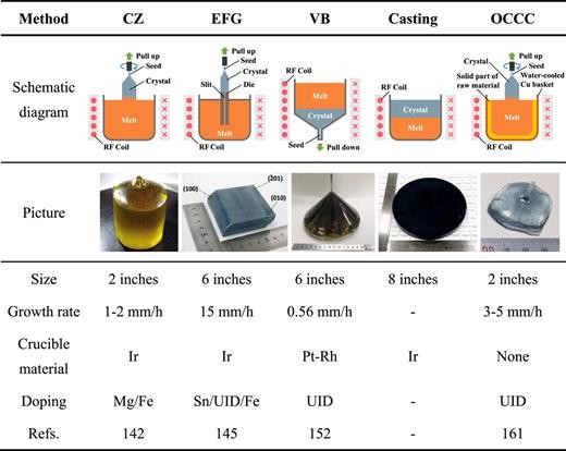 FIG. 6. Schematic diagrams, pictures, and parameters of bulk β-Ga2O3 crystal growth using different methods.