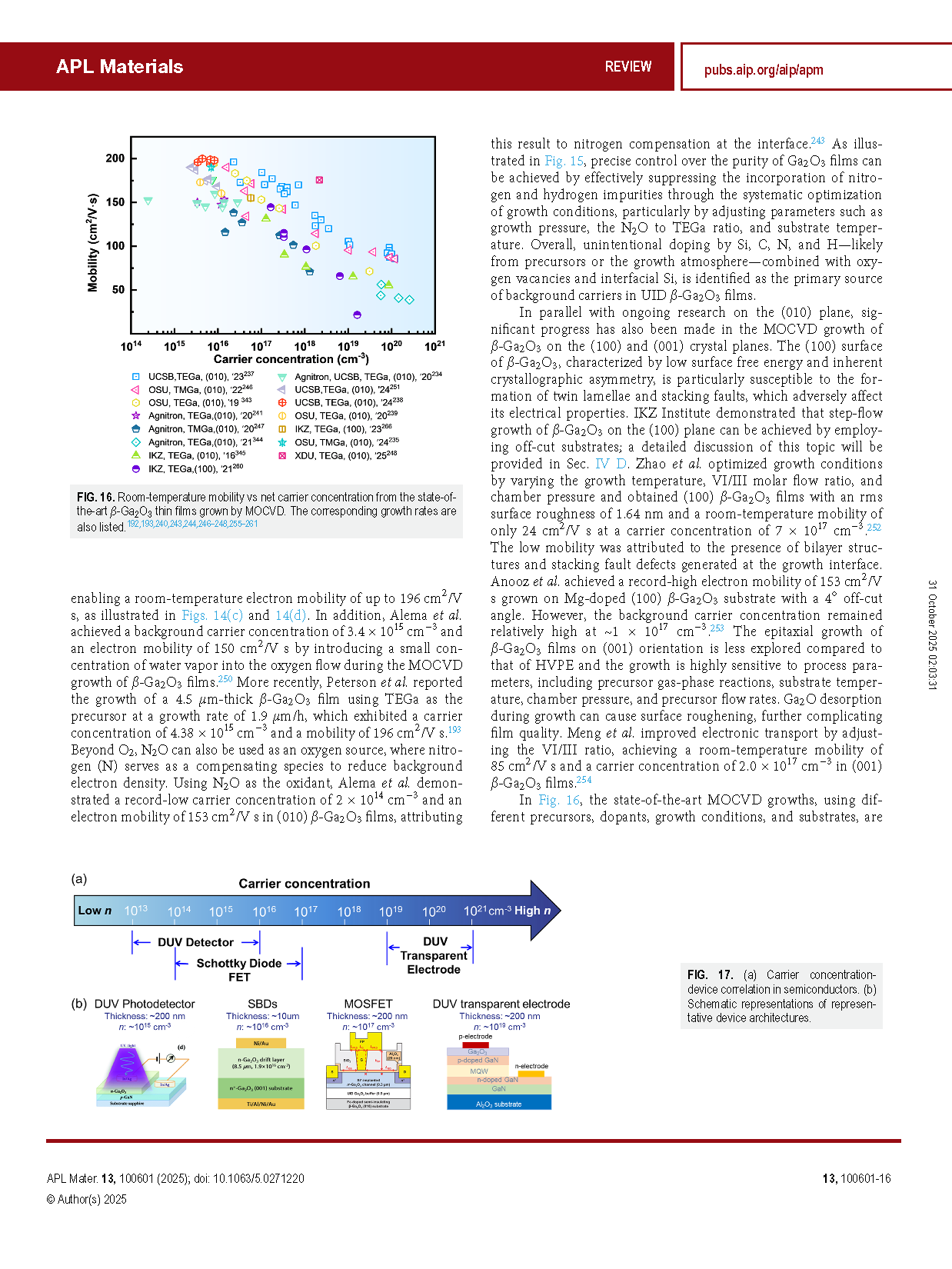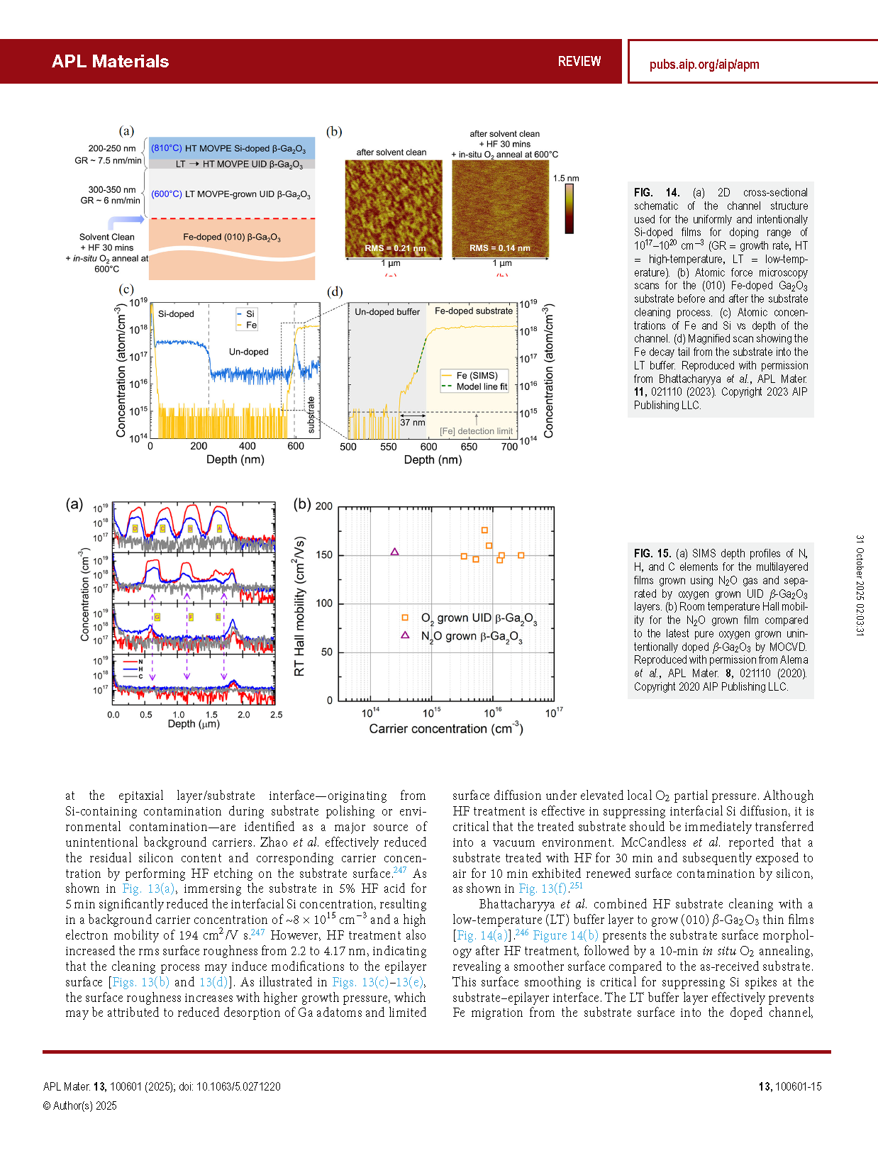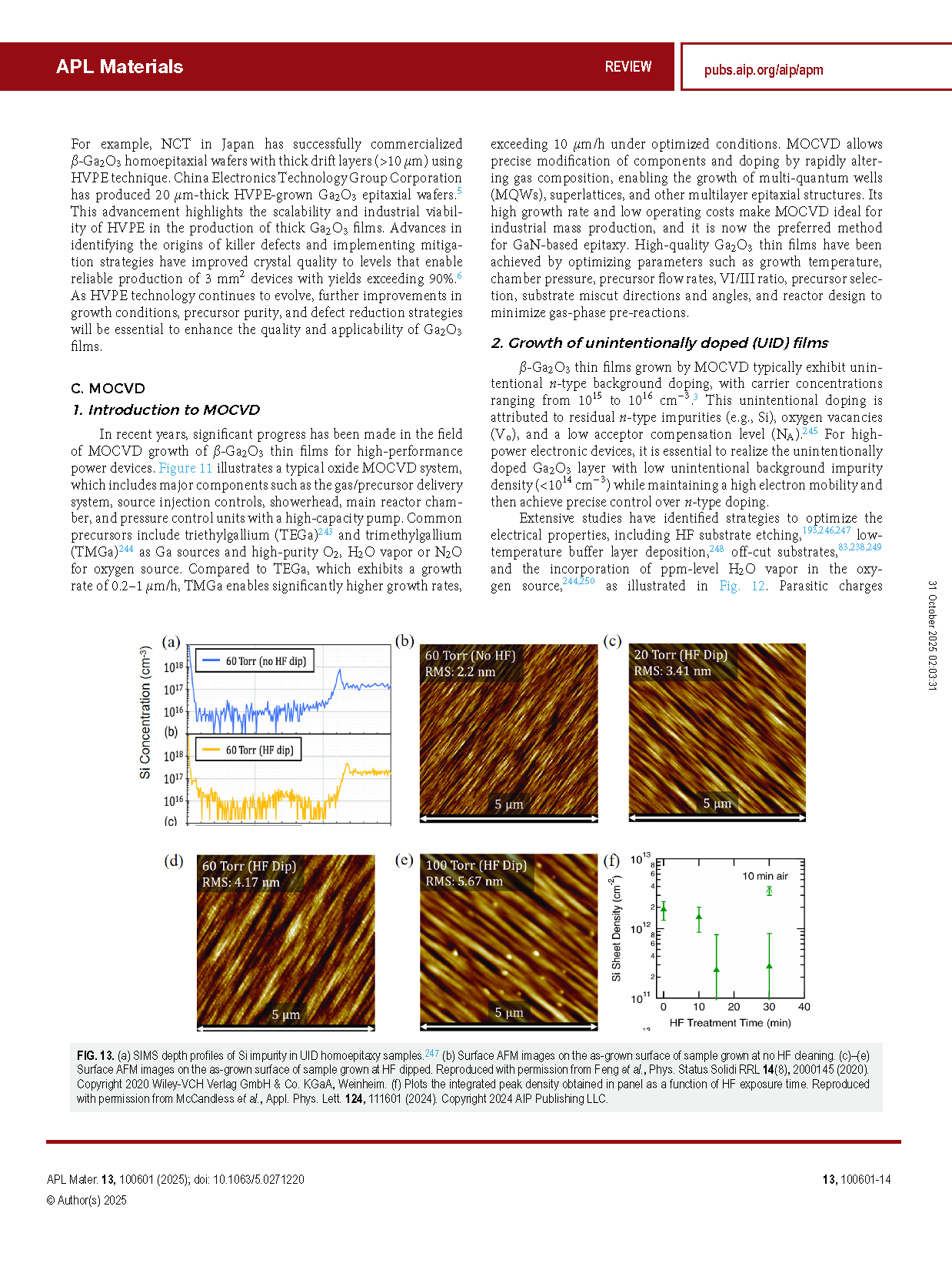 Significant progress has also been made in the epitaxial growth of Ga2O3 thin films and the control of electrical properties through doping. HVPE has demonstrated high growth rates for thick Ga2O3 films, with 4 in. wafers featuring film thicknesses of 10–15 μm now being produced and commercialized. However, challenges such as Cl contamination and surface roughness persist, which require CMP to address. In addition, HVPE may face limitations in further cost reduction. As a result, MOCVD is gaining attention for Ga2O3 epitaxy, given its success in the low-cost, high-efficient mass production of GaN. Recent research has demonstrated the growth of high-quality Ga2O3 films on both (010) and (100) substrates, with mobilities of up to 200 cm2/V s and carrier concentrations controllable from 1015 to 1020 cm−3, primarily using Si dopants. However, these films are typically grown on small substrates with thickness of less than 8 μm and relatively low growth rates compared to HVPE. The next step for MOCVD research will be to achieve thicker films (>10 μm) with faster growth rates (>5 μm/h) on larger wafers (>4 in.), enabling cost-effective production for mass manufacturing. In addition, the high density of large-size defects (killer defects) remains a challenge, and further research is needed to address this issue. Continued efforts to reduce defects, particularly twin boundaries, stacking faults, and large particles, will be critical for improving device reliability and performance. Although MBE has a slow growth rate (<1 nm/h), it excels in providing precise atomic-level control over film growth. This capability enables the fabrication of high-quality epitaxial layers with low defect densities, well-defined doping profiles, and sharp interfaces. MBE is particularly well-suited for the fabrication of (AlxGa1−x)2O3/Ga2O3 2DEG systems for radio frequency devices.