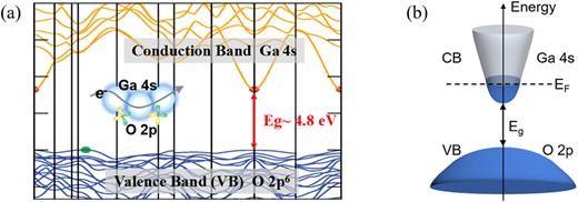 FIG. 5. (a) Band structure of β-Ga2O3 calculated by hybrid DFT. (b) Schematic energy diagram for Ga2O3, showing the Ga 4s derived CB and O 2p derived VB.