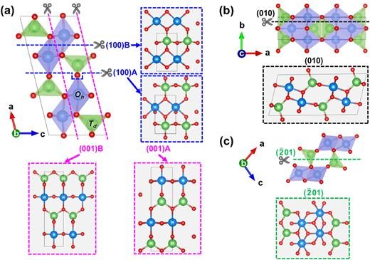 FIG. 4. (a) Monoclinic β-Ga2O3 crystal structure. The (100) and (001) surface cuts are depicted by the blue and magenta dashed lines, respectively. “A” and “B” indicate different surface terminations. The atom arrangements of (100) and (001) surface cuts are shown in blue and magenta dashed boxes, respectively. (b) The (010) surface cut (black dashed line) and the atom arrangement of (010) surface cut (black dashed box). (c) The (-201) surface cut (green dashed line) and the atom arrangement of (-201) surface cut (green dashed box).