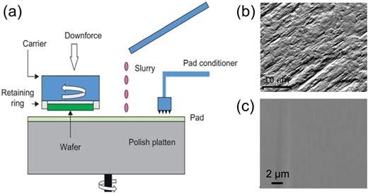 FIG. 9. (a) Schematic diagram of chemical mechanical polishing. (b) As-grown homoepitaxial layer surface. (c) Etched surface of the CMP processed homoepitaxial layer.