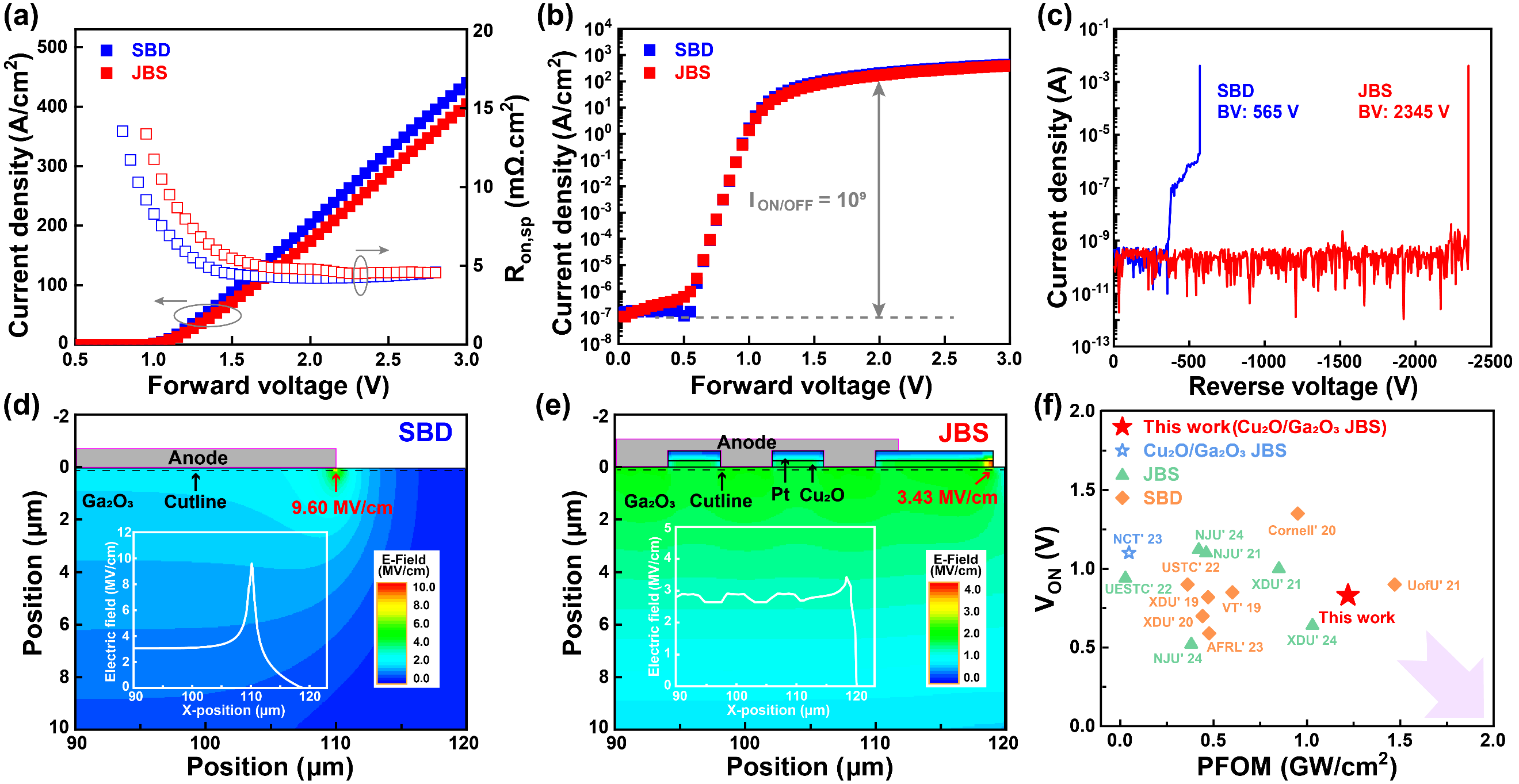 Fig. 2. Forward I–V characteristics of Ga2O3 SBD and JBS diode (a) in the linear-scale and (b) in the log-scale. (c) Reverse I–V characteristics for both devices. Simulated electric field distributions and the corresponding extracted electric field profiles for the (d) SBD and (e) the JBS diode. (f) Benchmark plot of VON versus PFOM for reported state-of-the-art Ga2O3 diodes.