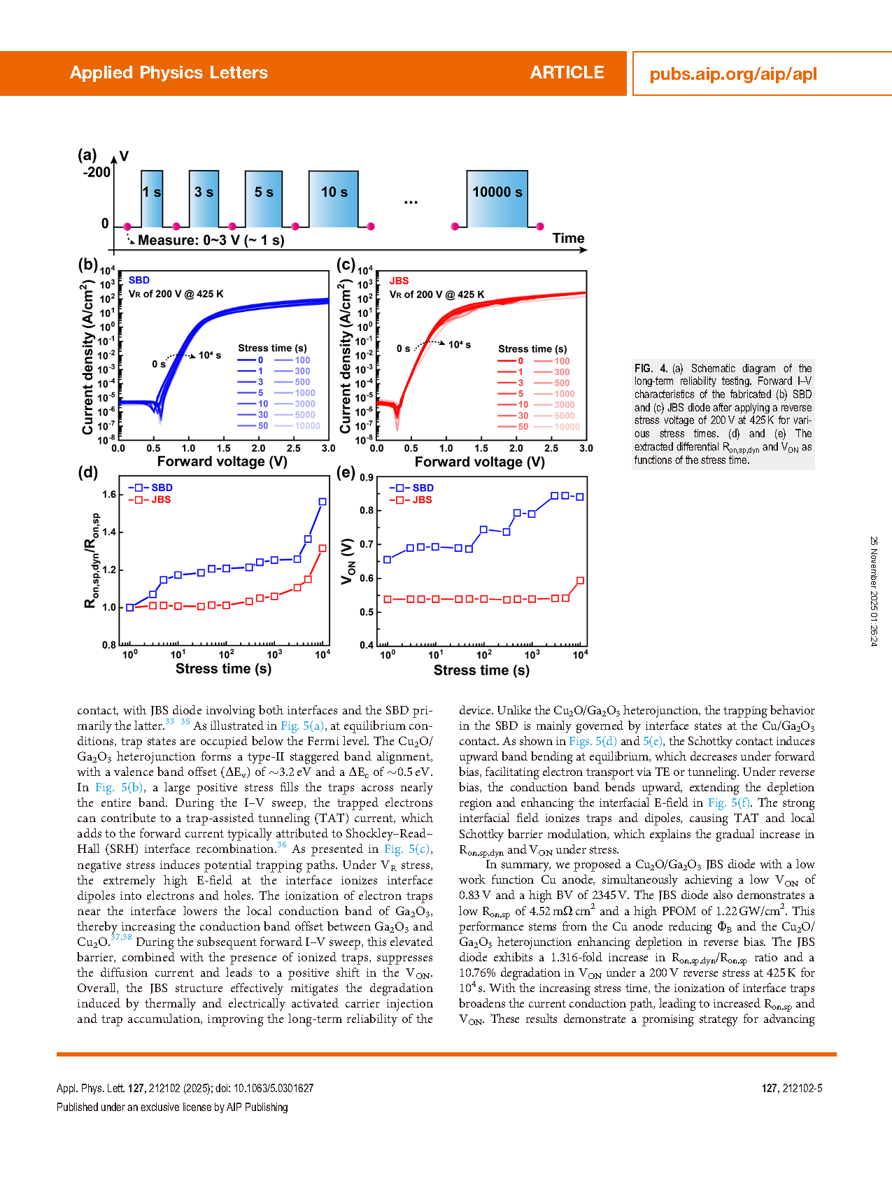 In summary, we proposed a Cu2O/Ga2O3 JBS diode with a low work function Cu anode, simultaneously achieving a low VON of 0.83 V and a high BV of 2345 V. The JBS diode also demonstrates a low Ron,sp of 4.52 mΩ·cm2 and a high PFOM of 1.22 GW/cm2. This performance stems from the Cu anode reducing ΦB and the Cu2O/Ga2O3 heterojunction enhancing depletion in reverse bias. The JBS diode exhibits a 1.316-fold increase in Ron,sp,dyn/Ron,sp ratio and a 10.76% degradation in VON under a 200 V reverse stress at 425 K for 104 s. With the increasing stress time, the ionization of interface traps broadens the current conduction path, leading to increased Ron,sp and VON. These results demonstrate a promising strategy for advancing the performance and reliability of Ga2O3 power devices for high-voltage and high-temperature applications
