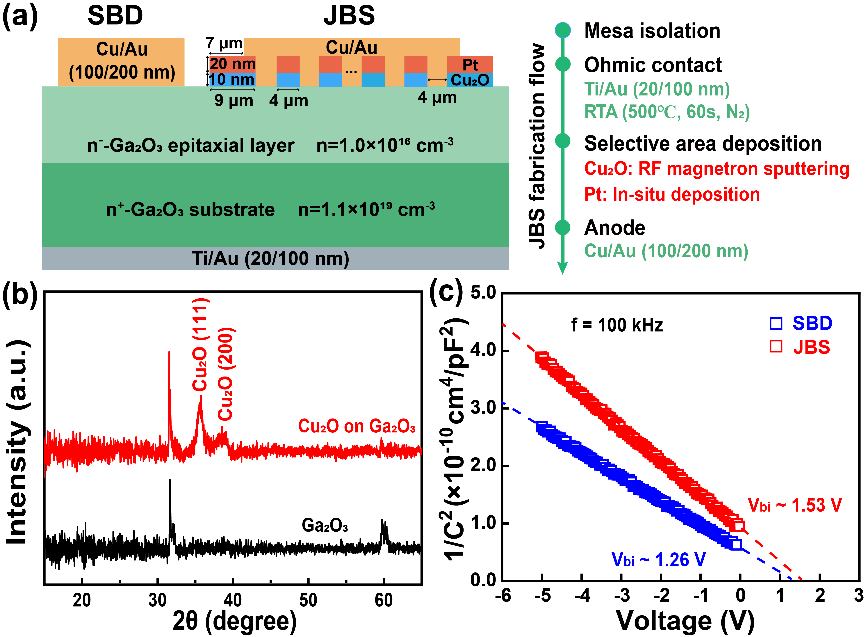 Fig. 1. (a) Schematic cross-sectional view and fabrication flow of the Ga2O3 SBD and JBS diodes with a Cu anode. (b) The XRD patterns of the Ga2O3 wafer and the Cu2O layer deposited on Ga2O3. (c) 1/C2-V results measured at 100 kHz.