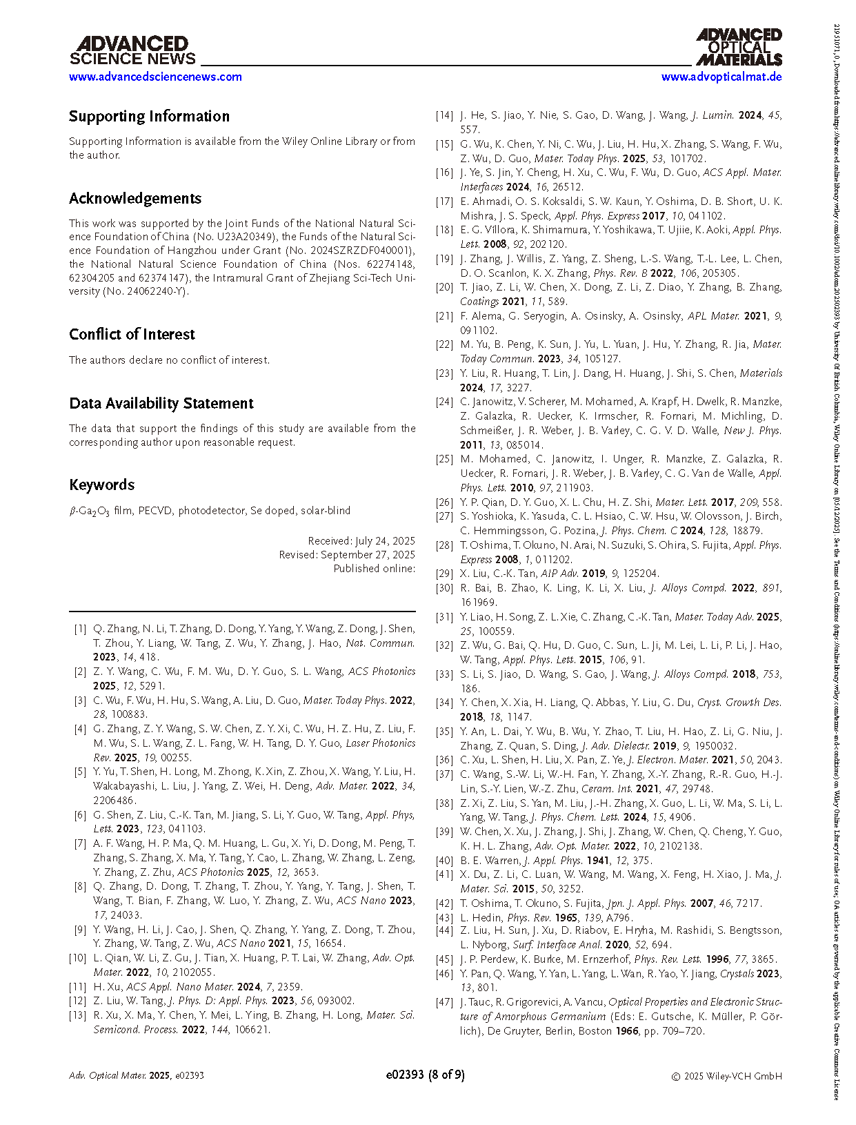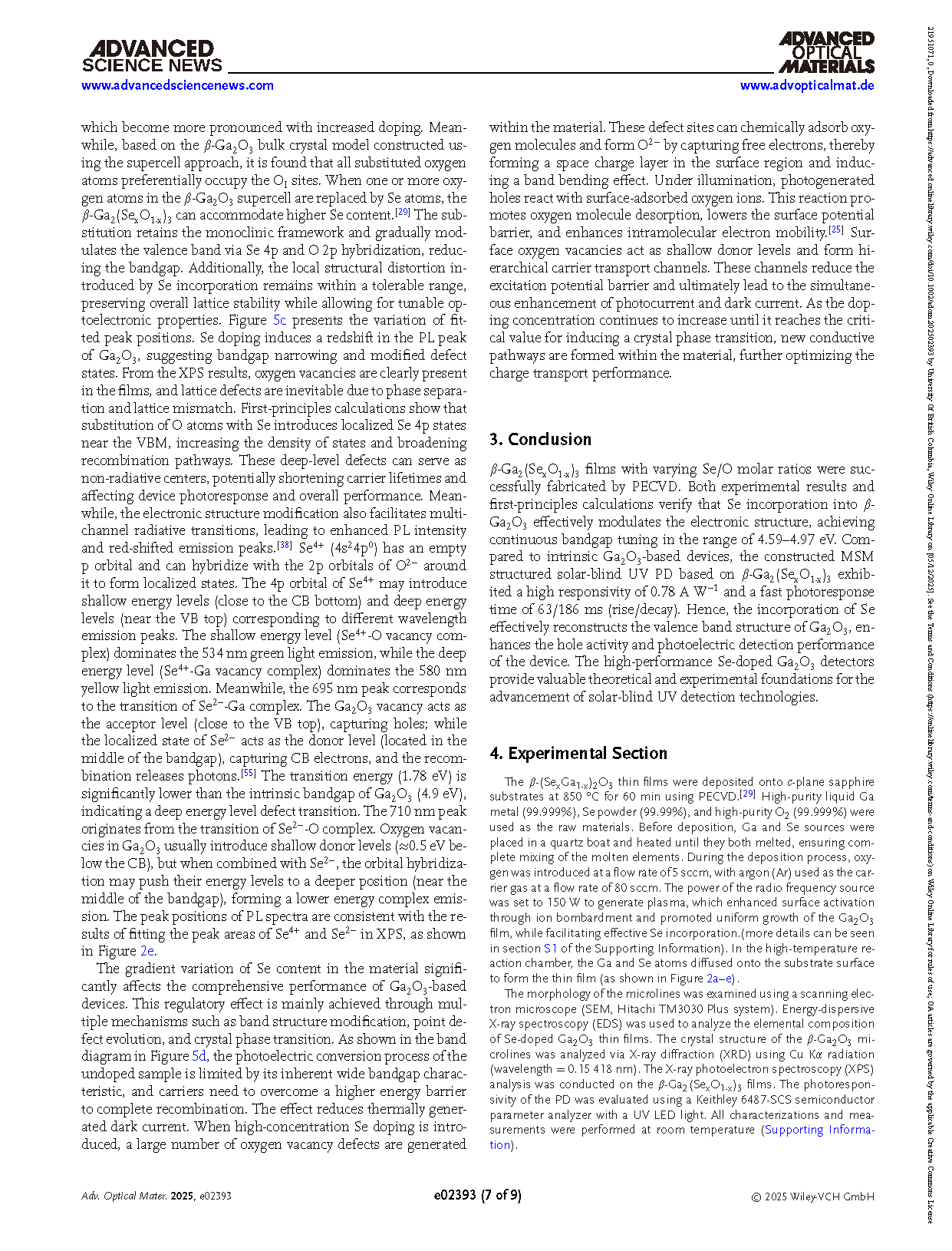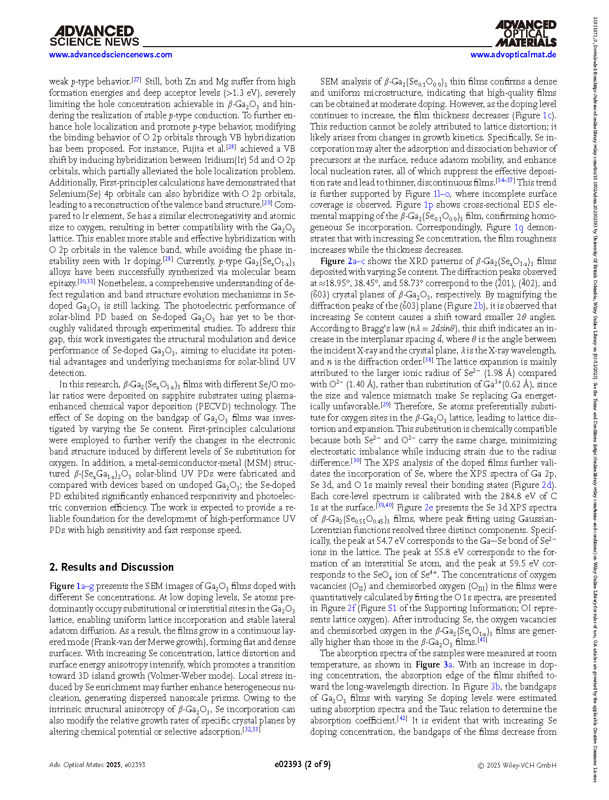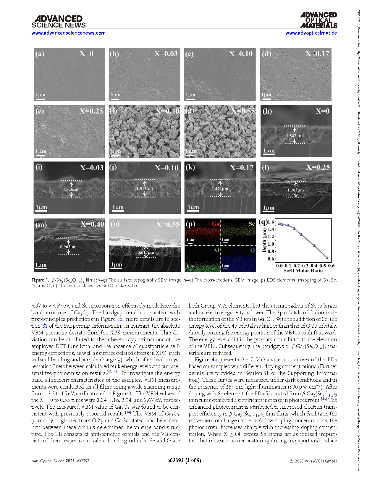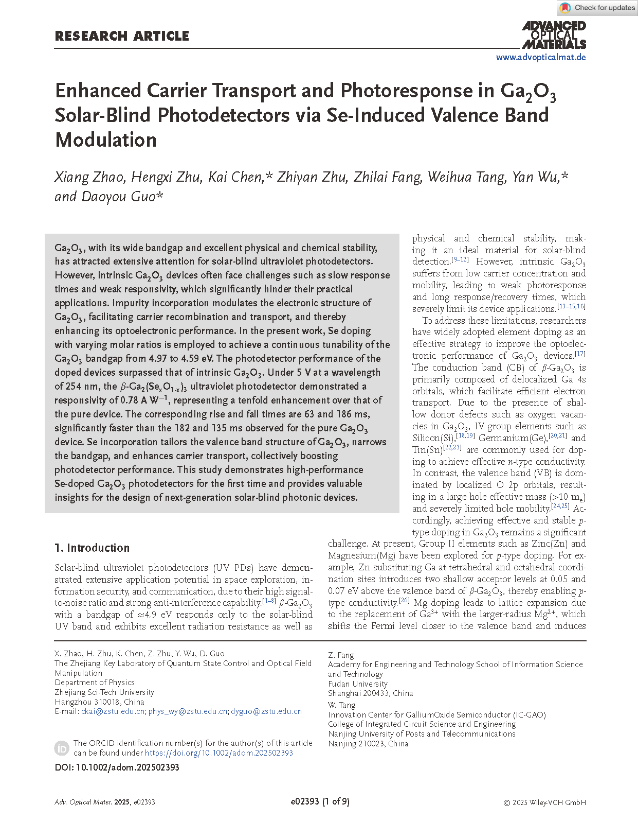 Researchers from the Zhejiang Sci-Tech University have published a dissertation titled "Enhanced Carrier Transport and Photoresponse in Ga2O3 Solar-Blind Photodetectors via Se-Induced Valence Band Modulation" in Advanced Optical Materials.