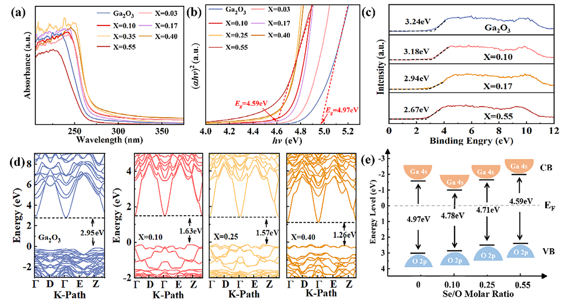 Figure 3. β-Ga2(SexO1-x)3 films: a) UV–vis spectra; b) Tauc’s plot; c) VBM spectra; d) First-principles calculations bandgap structures; e) Schematic diagrams of energy band.