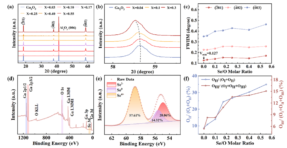 Figure 2. β-Ga2(SexO1-x)3 films: a) XRD patterns; b) Enlarged view of the (603) diffraction peak; c) FWHM of the diffraction peaks; d) Full XPS spectra; ̄ e) XPS spectrum of Se 3d; f) Quantitative analysis of OII and OIII species obtained from the O 1s XPS spectra.