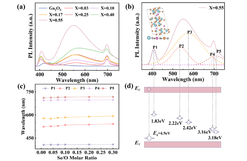 Figure 5. β-Ga2(SexO1-x)3 films: a) PL spectra; b) PL peak fitting and atomic structure model; c) Variation of fitted peak positions; d) The position for fitted PL peak in the energy band.