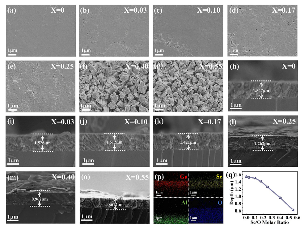Figure 1. β-Ga2(SexO1-x)3 films: a–g) The surface topography SEM image. h–o) The cross-sectional SEM image; p) EDS elemental mapping of Ga, Se, Al, and O; q) The film thickness vs Se/O molar ratio.