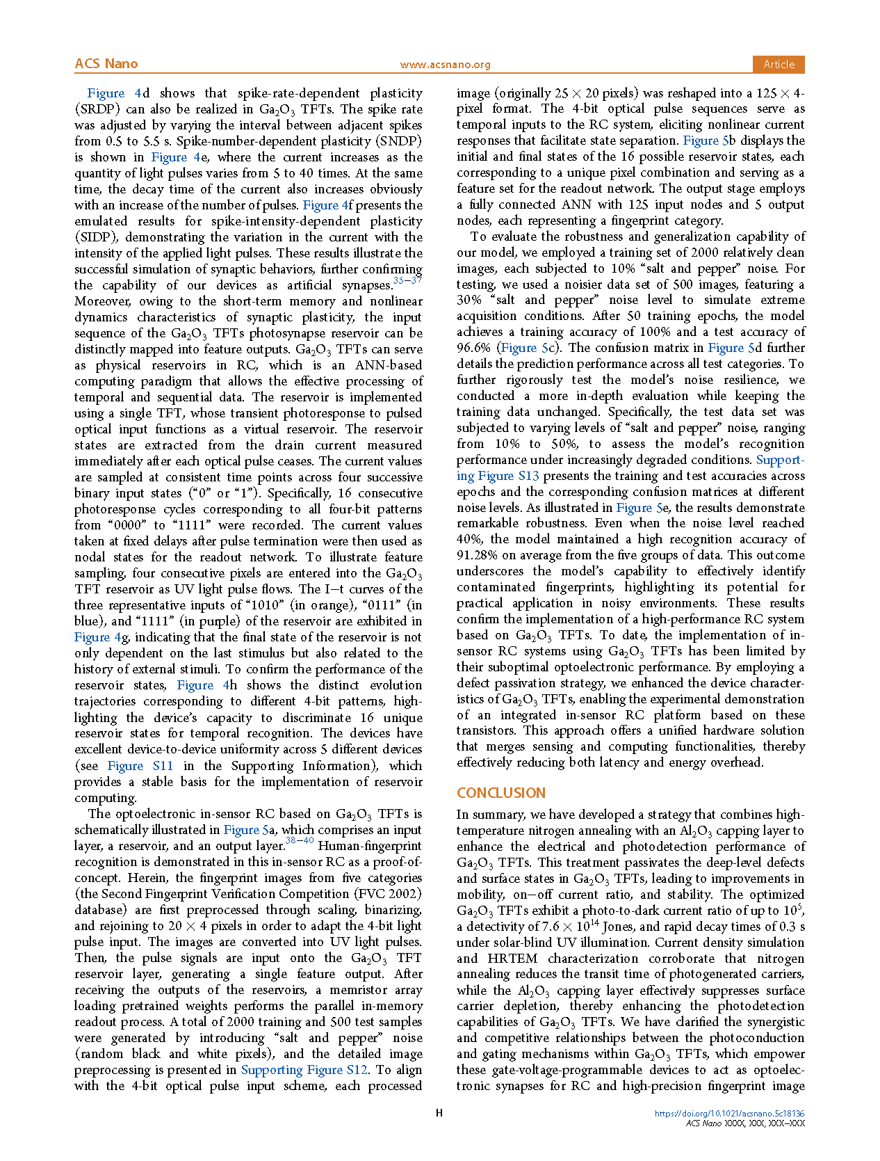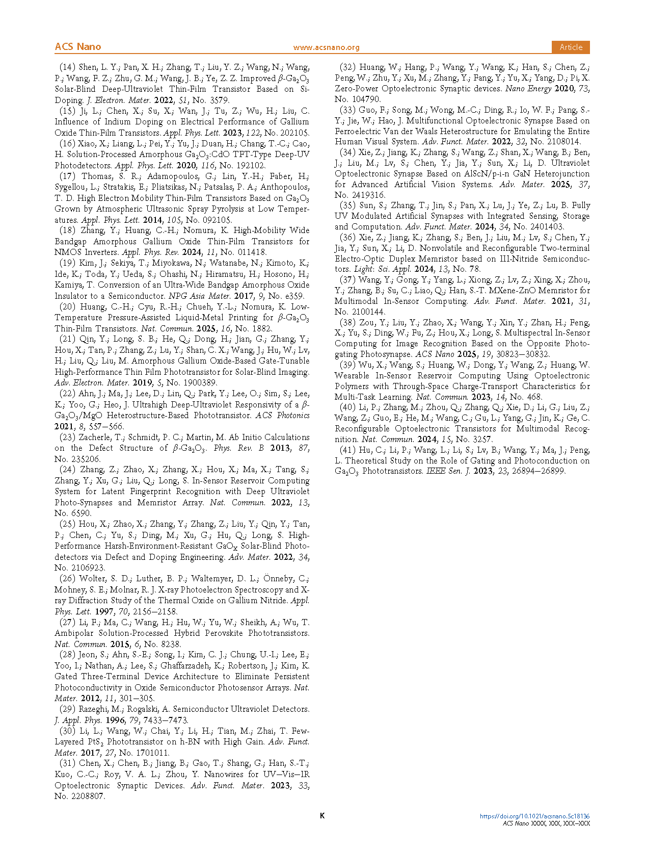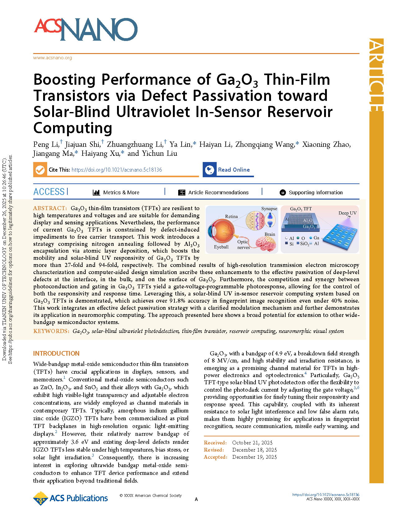 Researchers from the Northeast Normal University have published a dissertation titled "Boosting Performance of Ga2O3 Thin-Film Transistors via Defect Passivation toward Solar-Blind Ultraviolet In-Sensor Reservoir Computing" in ACS Nano.