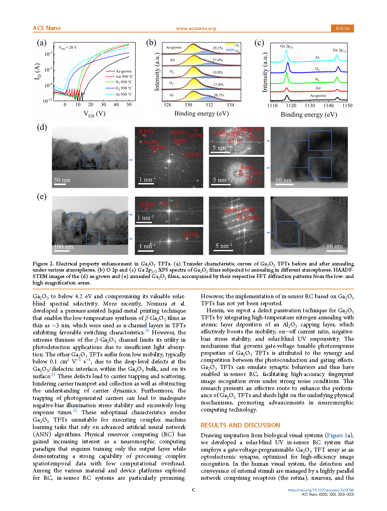 Figure 2. Electrical property enhancement in Ga2O3 TFTs. (a) Transfer characteristic curves of Ga2O3 TFTs before and after annealing under various atmospheres. (b) O 2p and (c) Ga 2p3/2 XPS spectra of Ga2O3 films subjected to annealing in different atmospheres. HAADFSTEM images of the (d) as-grown and (e) annealed Ga2O3 films, accompanied by their respective FFT diffraction patterns from the low- and high-magnification areas.