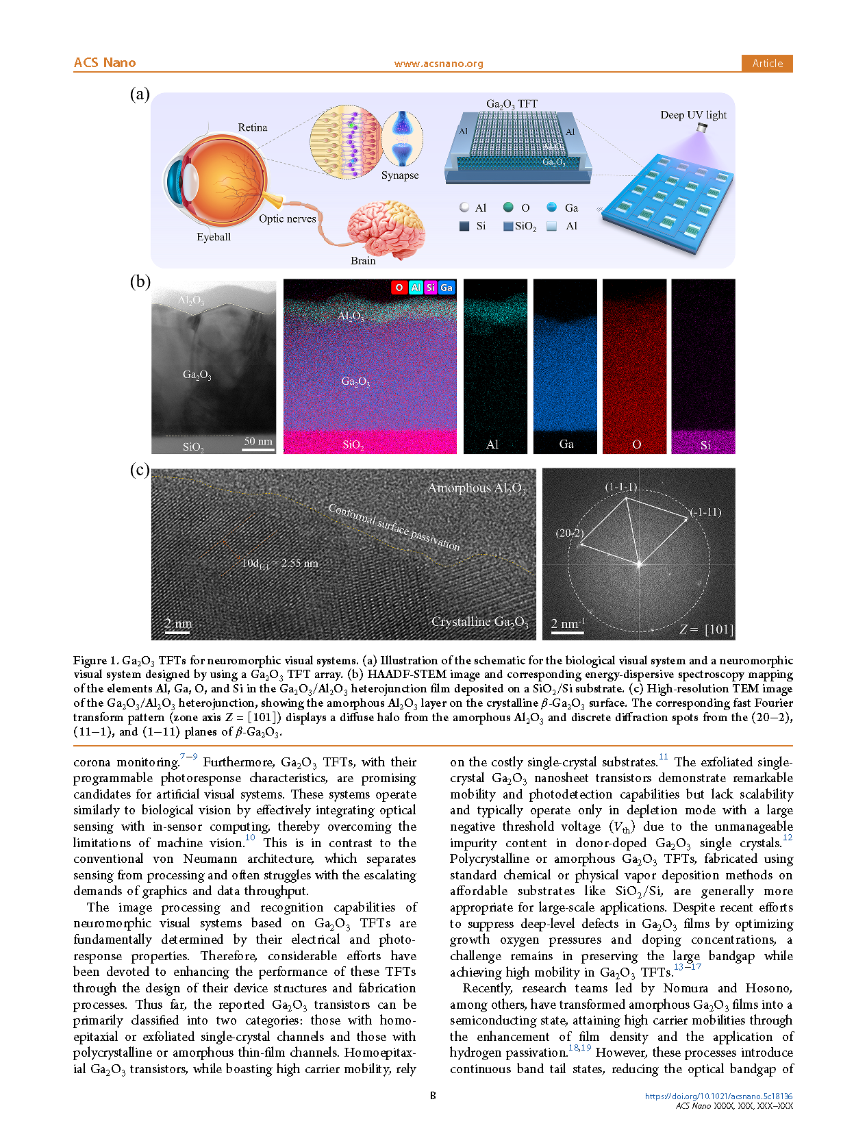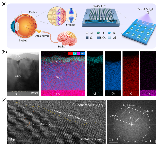 Figure 1. Ga2O3 TFTs for neuromorphic visual systems. (a) Illustration of the schematic for the biological visual system and a neuromorphic visual system designed by using a Ga2O3 TFT array. (b) HAADF-STEM image and corresponding energy-dispersive spectroscopy mapping of the elements Al, Ga, O, and Si in the Ga2O3/Al2O3 heterojunction film deposited on a SiO2/Si substrate. (c) High-resolution TEM image of the Ga2O3/Al2O3 heterojunction, showing the amorphous Al2O3 layer on the crystalline β-Ga2O3 surface. The corresponding fast Fourier transform pattern (zone axis Z = [101]) displays a diffuse halo from the amorphous Al2O3 and discrete diffraction spots from the (20−2), (11−1), and (1−11) planes of β-Ga22O3.