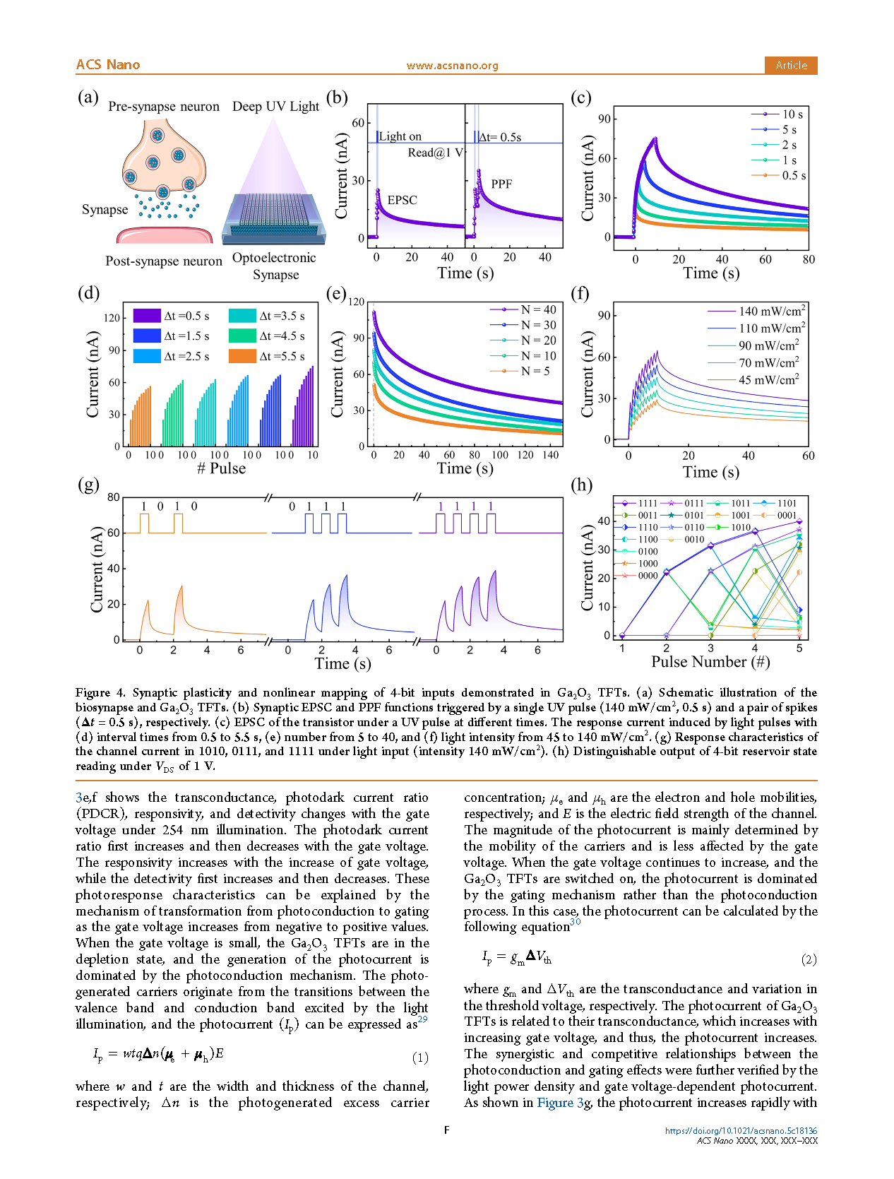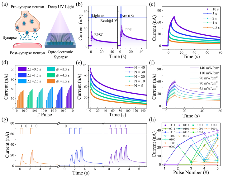 Figure 4. Synaptic plasticity and nonlinear mapping of 4-bit inputs demonstrated in Ga2O3 TFTs. (a) Schematic illustration of the biosynapse and Ga2O3 TFTs. (b) Synaptic EPSC and PPF functions triggered by a single UV pulse (140 mW/cm2, 0.5 s) and a pair of spikes (Δt = 0.5 s), respectively. (c) EPSC of the transistor under a UV pulse at different times. The response current induced by light pulses with (d) interval times from 0.5 to 5.5 s, (e) number from 5 to 40, and (f) light intensity from 45 to 140 mW/cm2. (g) Response characteristics of the channel current in 1010, 0111, and 1111 under light input (intensity 140 mW/cm2). (h) Distinguishable output of 4-bit reservoir state reading under VDS of 1 V.
