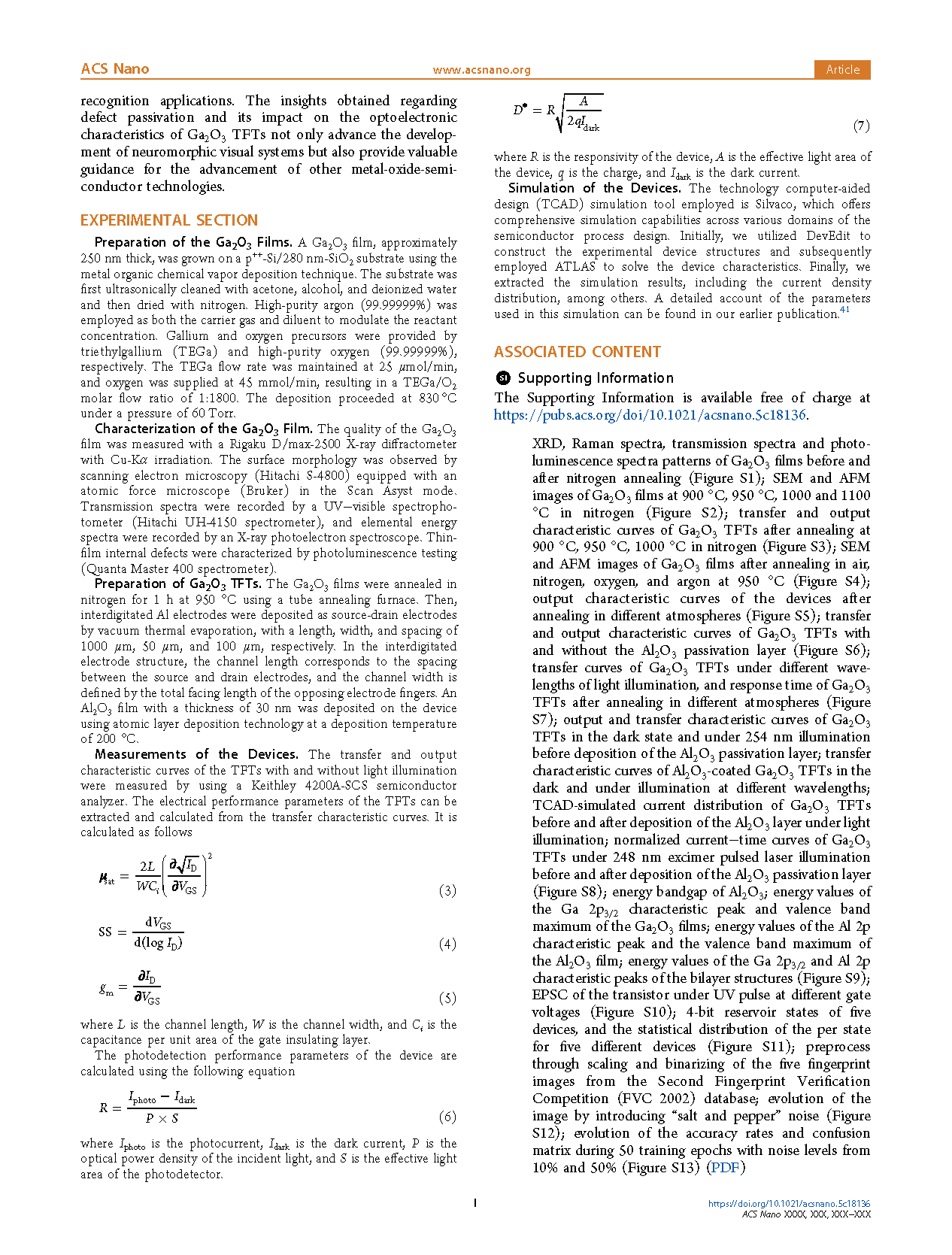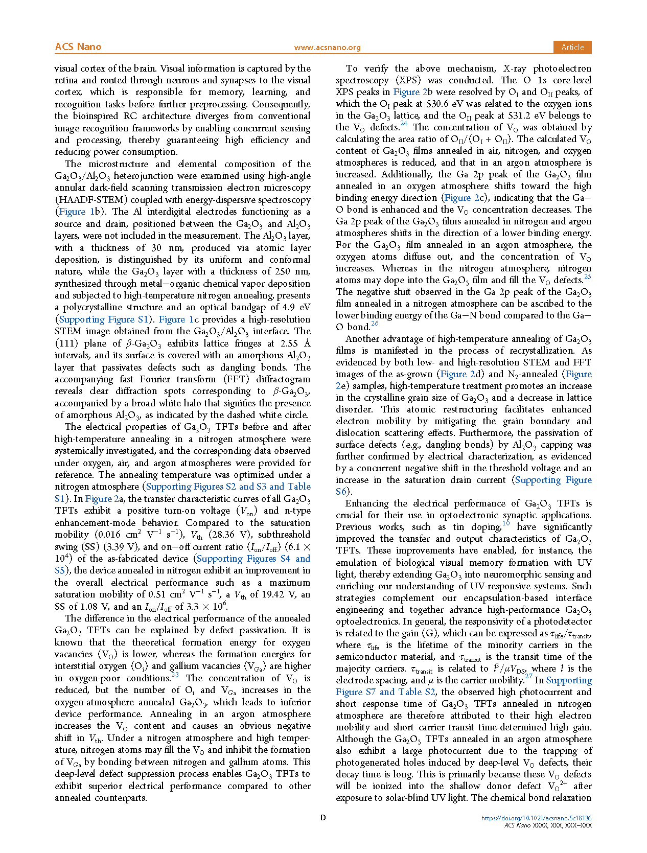 In summary, we have developed a strategy that combines high-temperature nitrogen annealing with an Al2O3 capping layer to enhance the electrical and photodetection performance of Ga2O3 TFTs. This treatment passivates the deep-level defects and surface states in Ga2O3 TFTs, leading to improvements in mobility, on−off current ratio, and stability. The optimized Ga2O3 TFTs exhibit a photo-to-dark current ratio of up to 105, a detectivity of 7.6 × 1014 Jones, and rapid decay times of 0.3 s under solar-blind UV illumination. Current density simulation and HRTEM characterization corroborate that nitrogen annealing reduces the transit time of photogenerated carriers, while the Al2O3 capping layer effectively suppresses surface carrier depletion, thereby enhancing the photodetection capabilities of Ga2O3 TFTs. We have clarified the synergistic and competitive relationships between the photoconduction and gating mechanisms within Ga2O3 TFTs, which empower these gate-voltage-programmable devices to act as optoelectronic synapses for RC and high-precision fingerprint image recognition applications. The insights obtained regarding defect passivation and its impact on the optoelectronic characteristics of Ga2O3 TFTs not only advance the development of neuromorphic visual systems but also provide valuable guidance for the advancement of other metal-oxide-semiconductor technologies.