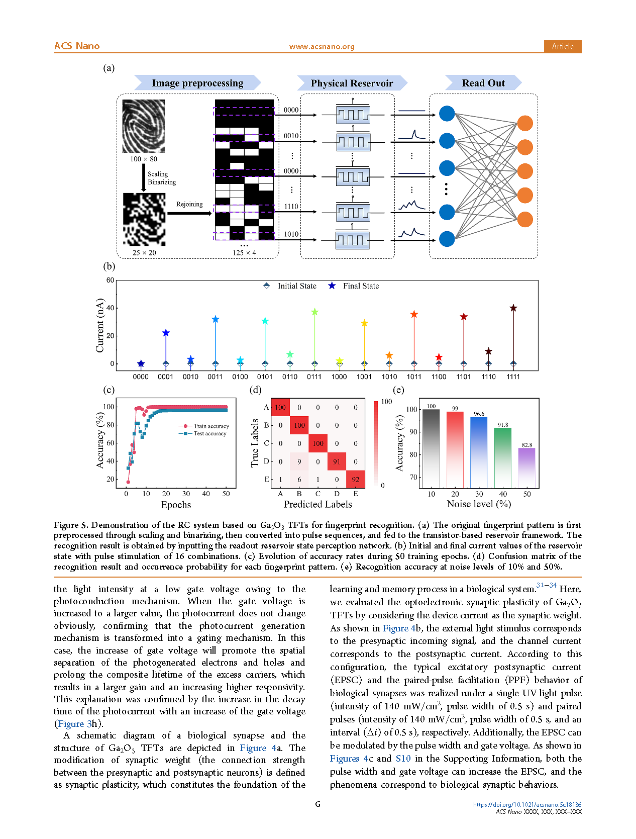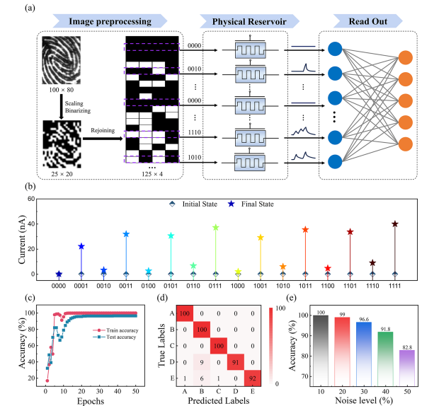 Figure 5. Demonstration of the RC system based on Ga2O3 TFTs for fingerprint recognition. (a) The original fingerprint pattern is first preprocessed through scaling and binarizing, then converted into pulse sequences, and fed to the transistor-based reservoir framework. The recognition result is obtained by inputting the readout reservoir state perception network. (b) Initial and final current values of the reservoir state with pulse stimulation of 16 combinations. (c) Evolution of accuracy rates during 50 training epochs. (d) Confusion matrix of the recognition result and occurrence probability for each fingerprint pattern. (e) Recognition accuracy at noise levels of 10% and 50%.
