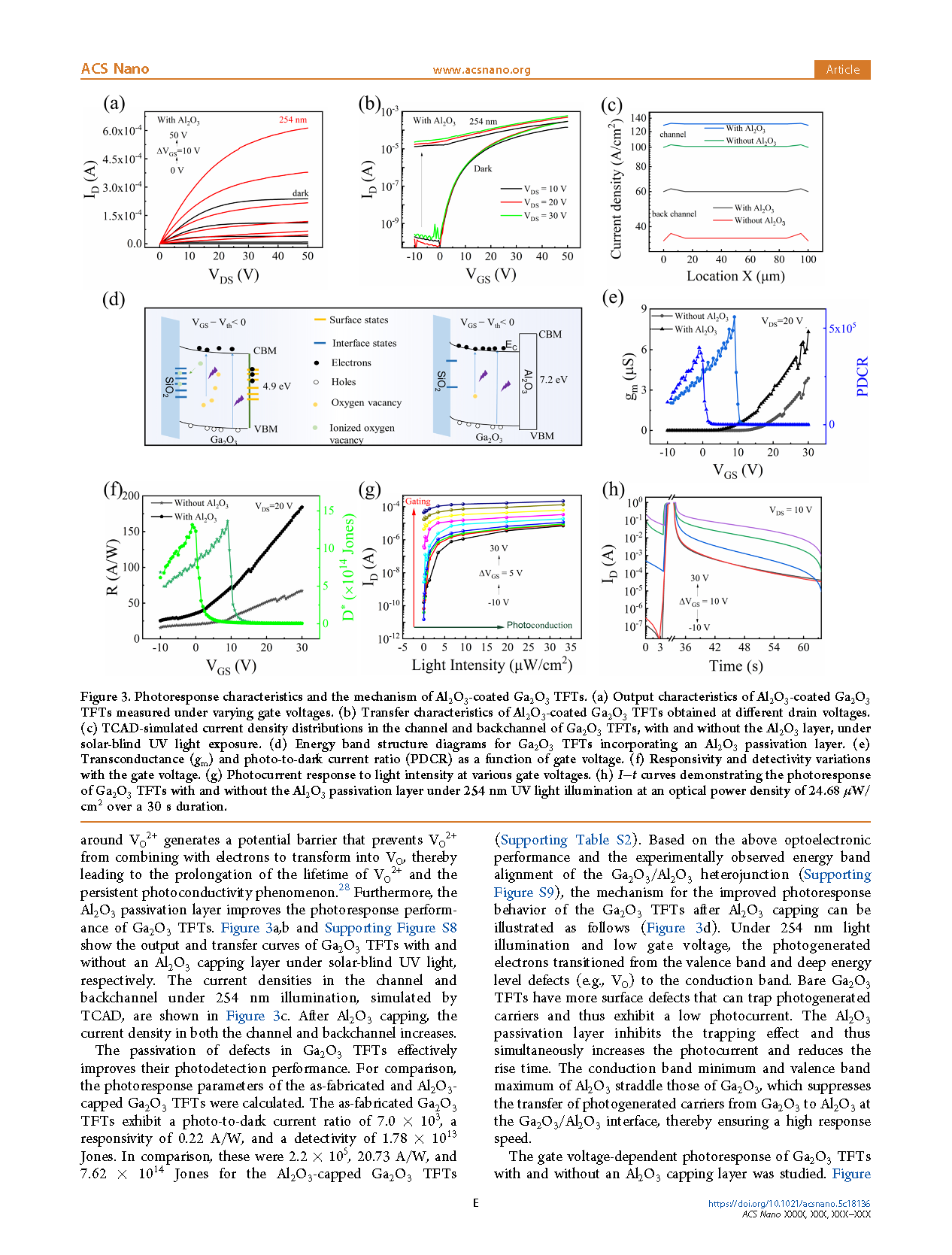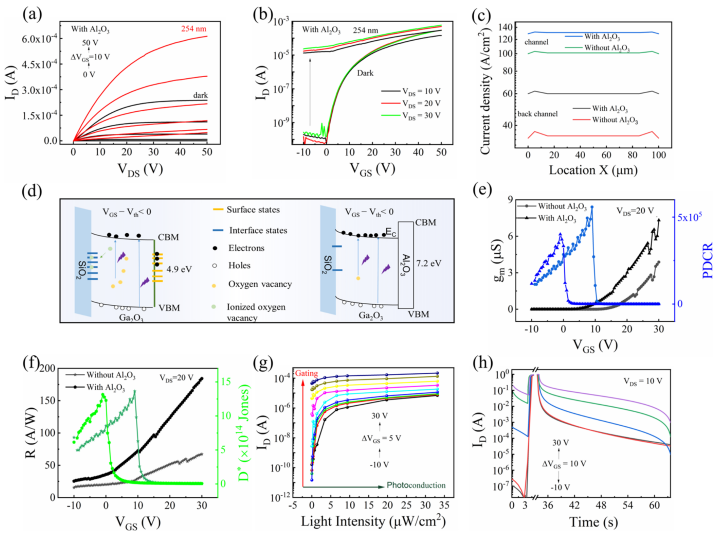 Figure 3. Photoresponse characteristics and the mechanism of Al2O3-coated Ga2O3 TFTs. (a) Output characteristics of Al2O3-coated Ga2O3 TFTs measured under varying gate voltages. (b) Transfer characteristics of Al2O3-coated Ga2O3 TFTs obtained at different drain voltages. (c) TCAD-simulated current density distributions in the channel and backchannel of Ga2O3 TFTs, with and without the Al2O3 layer, under solar-blind UV light exposure. (d) Energy band structure diagrams for Ga2O3 TFTs incorporating an Al2O3 passivation layer. (e) Transconductance (gm) and photo-to-dark current ratio (PDCR) as a function of gate voltage. (f) Responsivity and detectivity variations with the gate voltage. (g) Photocurrent response to light intensity at various gate voltages. (h) I−t curves demonstrating the photoresponse of Ga2O3 TFTs with and without the Al2O3 passivation layer under 254 nm UV light illumination at an optical power density of 24.68 μW/ cm2 over a 30 s duration.