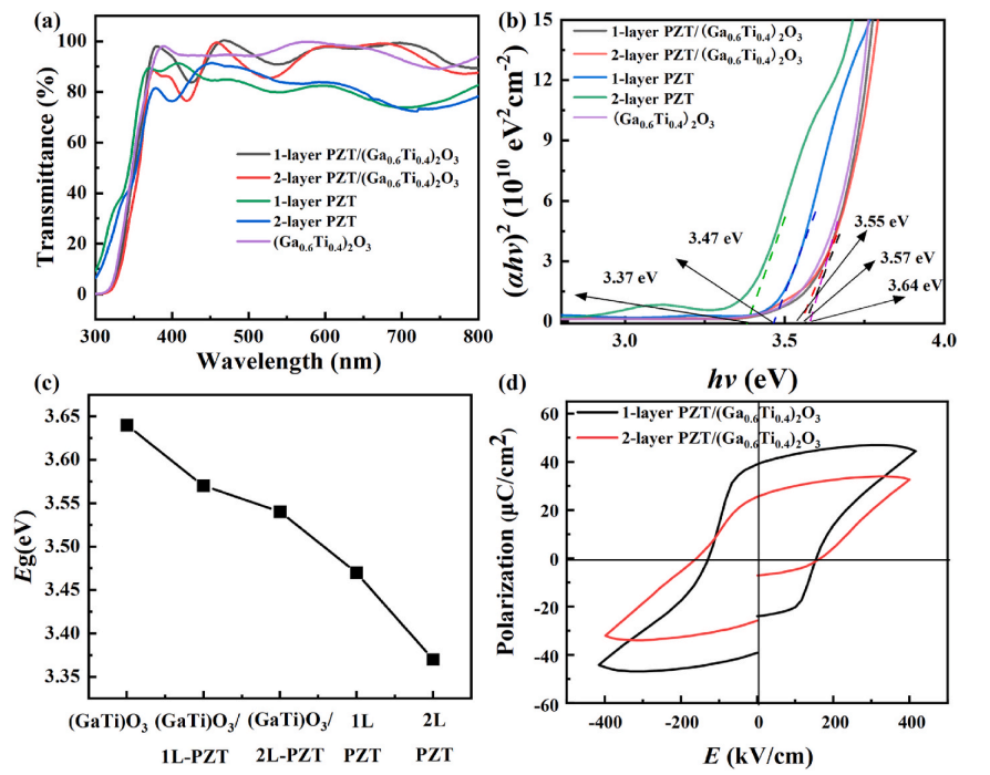 Fig. 4. (a) Transmission spectra, (b) (αhν) 2 versus hν plots, (c) bandgap of PZT and (Ga0.6Ti0.4)2O3 films, and PZT/(Ga0.6Ti0.4)2O3 heterojunction films. (d) P-E loops for PZT/(Ga0.6Ti0.4)2O3 heterojunction films.