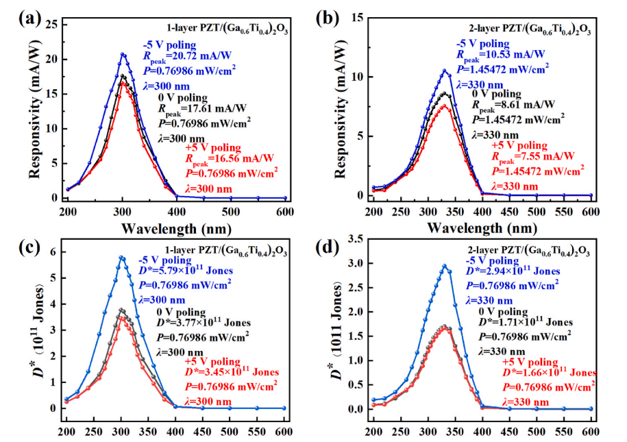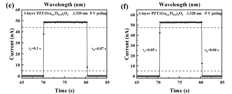 Fig. 6. (a)–(d) The responsivity and detectivity of PZT/(Ga0.6Ti0.4)2O3 heterojunction PDs with various poling voltages. Single-cycle, time-dependent photocurrent of the 1 layer-PZT/(Ga0.6Ti0.4)2O3 heterojunction PDs under switched-on/off UV light illumination and (e) 0 V and (f) − 5 V poling voltage.