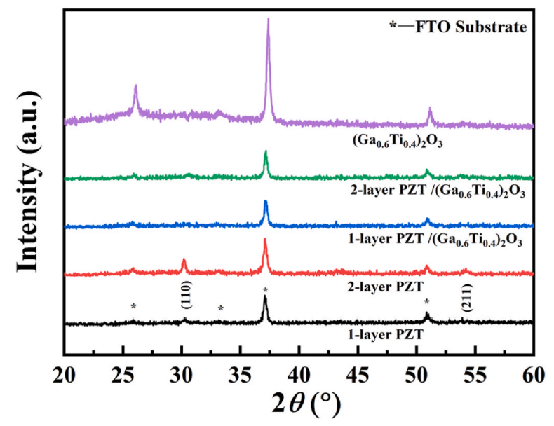 Fig. 2. XRD patterns of PZT and (Ga0.6Ti0.4)2O3 films, and PZT/(Ga0.6Ti0.4)2O3 heterojunction films.