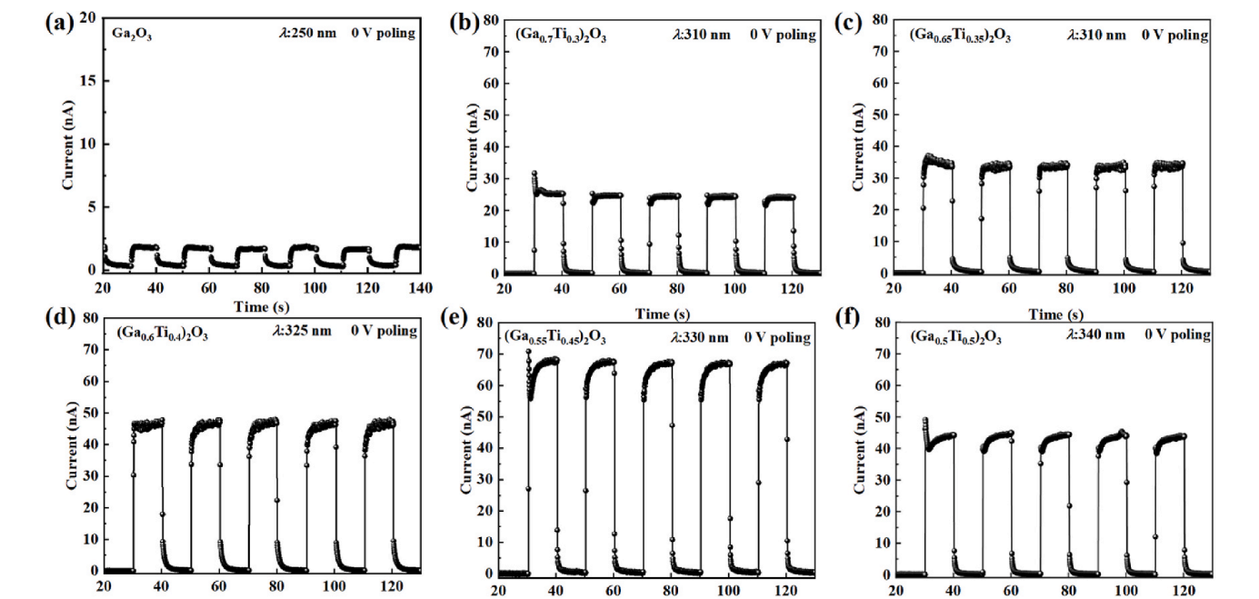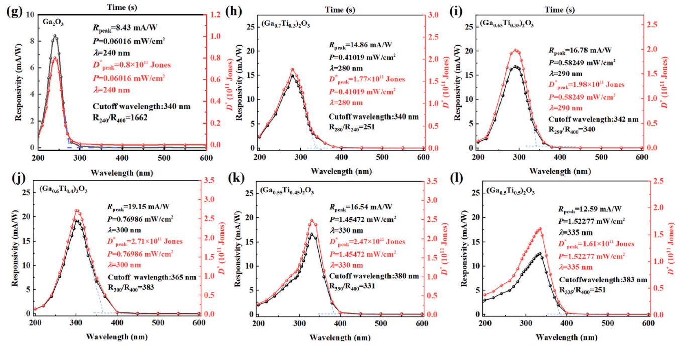 Fig. 1. (a)–(f) The photocurrent, and (g)–(l) responsivity and detectivity of the (Ga1-xTix)2O3 UV PDs under 0 V bias.
