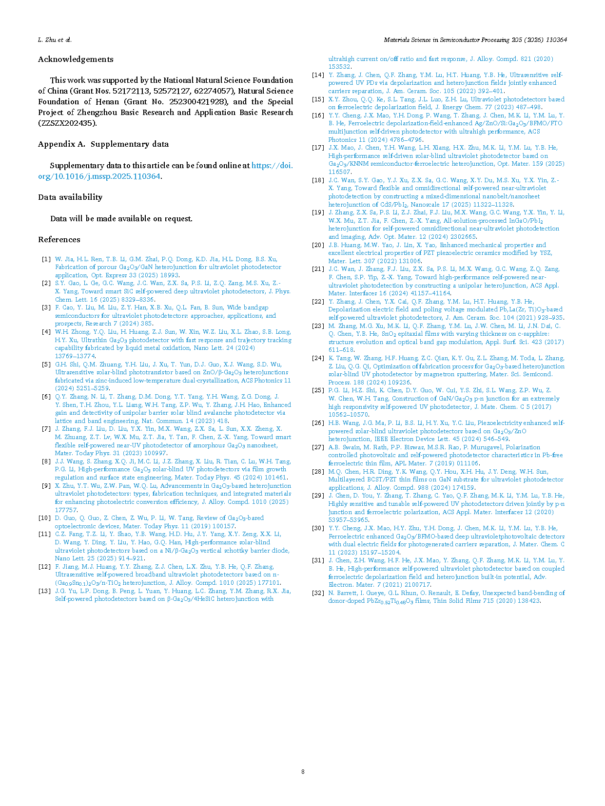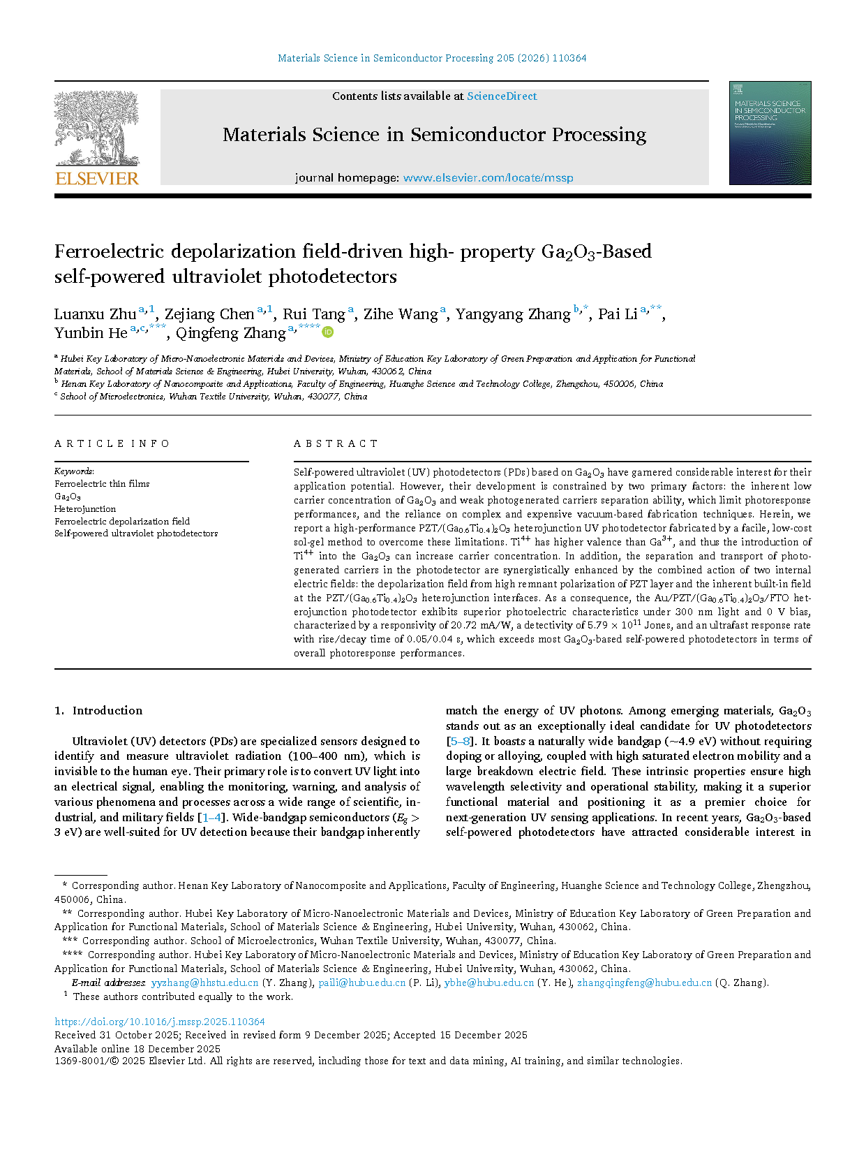 Researchers from the Hubei University have published a dissertation titled "Ferroelectric depolarization field-driven high- property Ga2O3-Based self-powered ultraviolet photodetectors" in Materials Science in Semiconductor Processing.