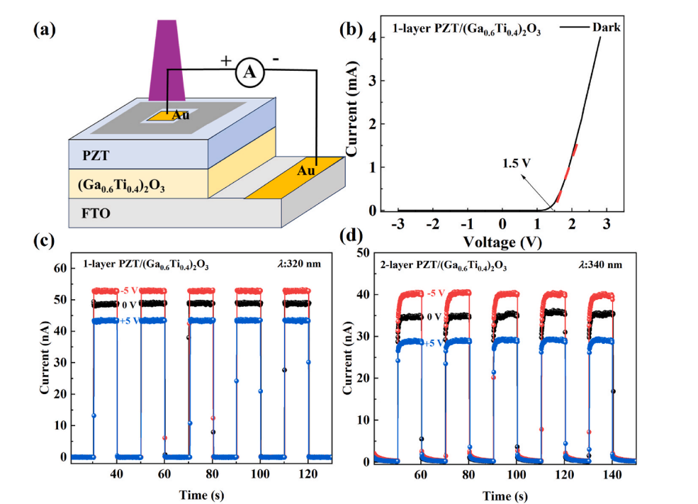Fig. 5. (a) Schematic structure diagram of PZT/(Ga0.6Ti0.4)2O3 heterojunction UV PDs. (b) I-V characteristic curves of the PDs with 1-layer PZT in the dark. Timedependent photocurrent of PZT/(Ga0.6Ti0.4)2O3 heterojunction PDs with (c) 1-layer and (d) 2-layer PZT under switched-on/off UV light illumination and different poling voltages.