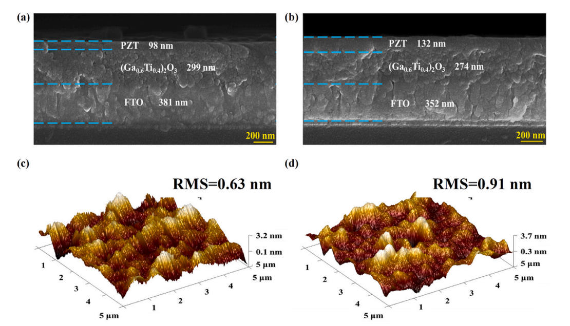 Fig. 3. Cross-sectional FE-SEM images of (a) 1-layer PZT/(Ga0.6Ti0.4)2O3 and (b) 2-layer PZT/(Ga0.6Ti0.4)2O3 heterojunction films. Three-dimensional AFM images of (c) 1-layer PZT/(Ga0.6Ti0.4)2O3 and (d) 2-layer PZT/(Ga0.6Ti0.4)2O3 heterojunction films.