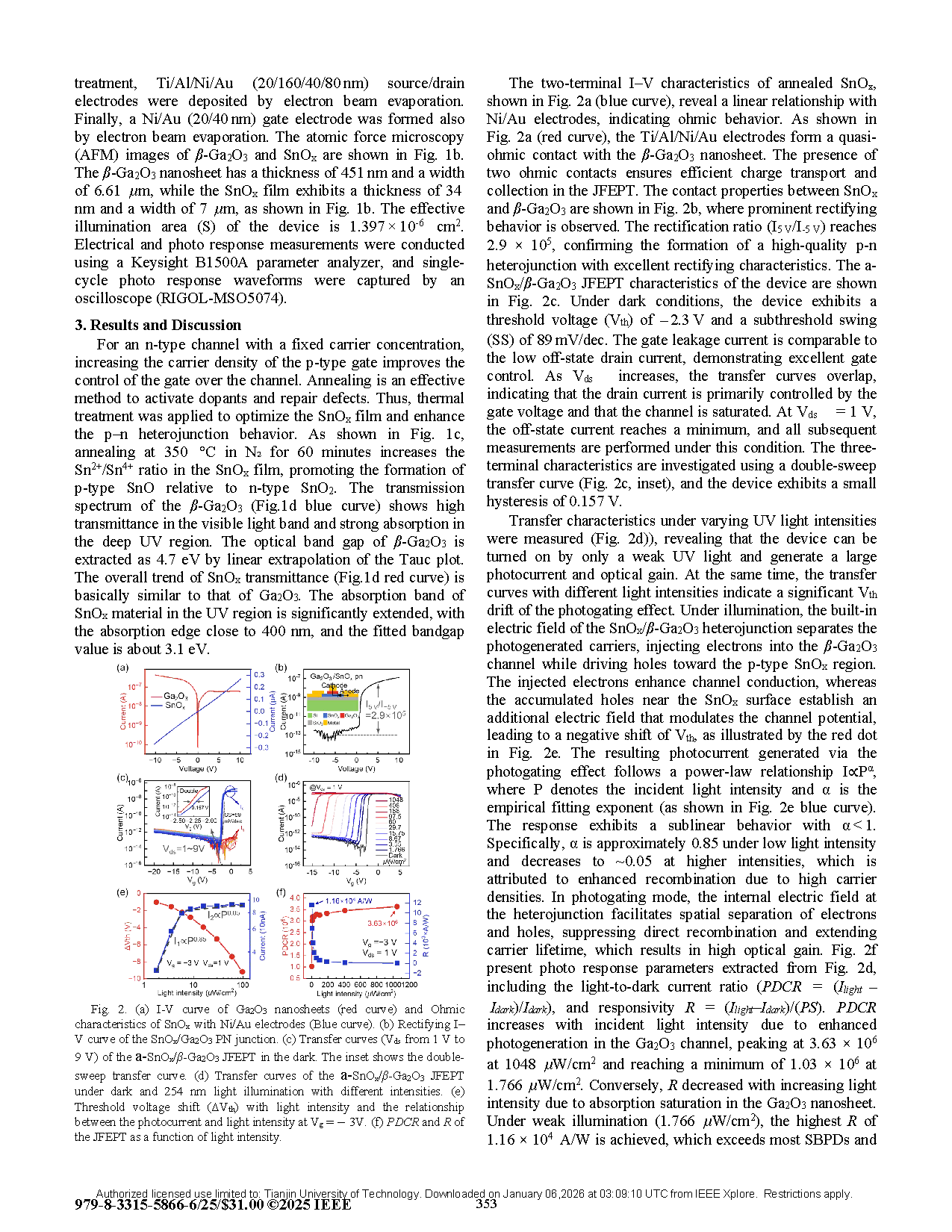 In summary, by employing a a-SnOx/β-Ga2O3 JFEPT structure and optimizing the SnOx layer via N2 annealing, we achieve a high-performance SBPD. This device delivers an outstanding responsivity of 1.16 × 104 A/Wunder UV illumination (1.766 µW/cm2), along with a high PDCR of 1.03 × 106. With increasing UV illumination, it retains rapid rise time of 487 µs. Overall, this work provides a promising strategy for designing and optimizing next- generation Ga2O3-based SBPDs.