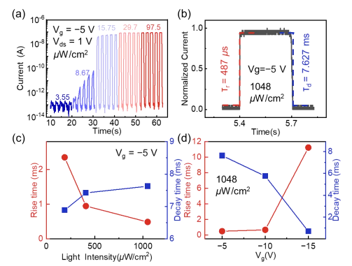 Fig. 3. (a) I-t curves of the a-SnOx/β-Ga2O3 JFEPT under different light intensities (Vg = −5 V, Vds = 1 V). (b) A magnified image of the I–t curve of the JFEPT device at Vg = −5 V and 1048 μW/cm2 illumination (captured by an oscilloscope). (c) Response time of the device as a function of light intensities. (d) Response time of the device as a function of gate voltages.
