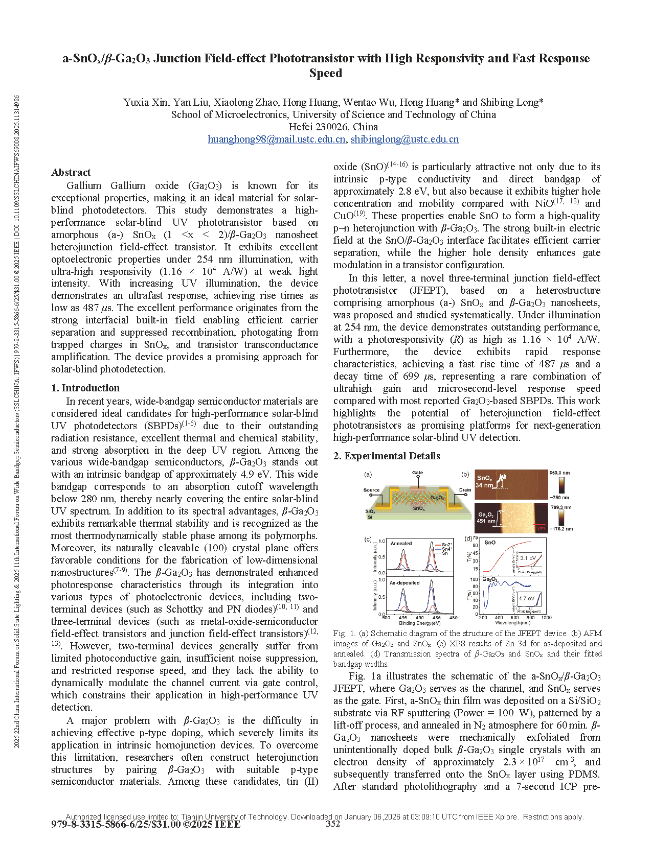 Researchers from the University of Science and Technology of China have published a dissertation titled "a-SnOx/β-Ga2O3 Junction Field-effect Phototransistor with High Responsivity and Fast Response Speed" in 2025 22nd China International Forum on Solid State Lighting & 2025 11th International Forum on Wide Bandgap Semiconductors (SSLCHINA: IFWS).