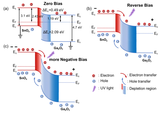 Fig. 4. (a) Schematic of the energy band diagrams of Ga2O3/SnOx heterojunction. (b) Schematics of the carrier transport mechanism under UV illumination with a negative gate bias applied. (c) Energy band diagram under UV illumination with a more negative gate bias applied.