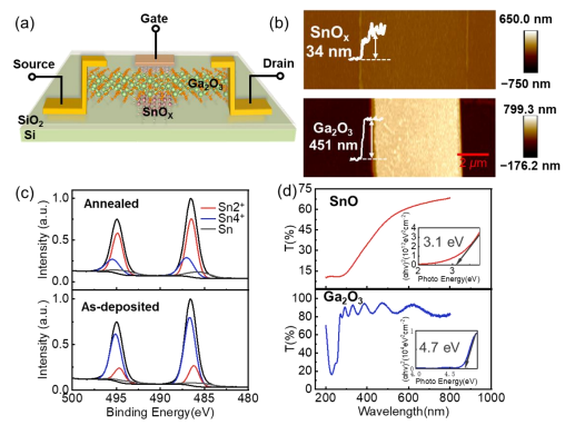 Fig. 1. (a) Schematic diagram of the structure of the JFEPT device. (b) AFM images of Ga2O3 and SnOx. (c) XPS results of Sn 3d for as-deposited and annealed. (d) Transmission spectra of β-Ga2O3 and SnOx and their fitted bandgap widths.