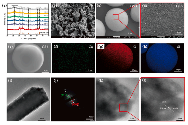 Fig. 2. XRD patterns of Ga2O3 and GS-series samples (a); SEM images of Ga2O3 (b), GS3 SEM image (c), and a magnified section of GS3 (d); SEM images of GS3 (e) with corresponding elemental mapping of Ga (f), O (g) and Si (h); TEM and HR-TEM images of GS3 showing morphology and lattice structure (i–l).