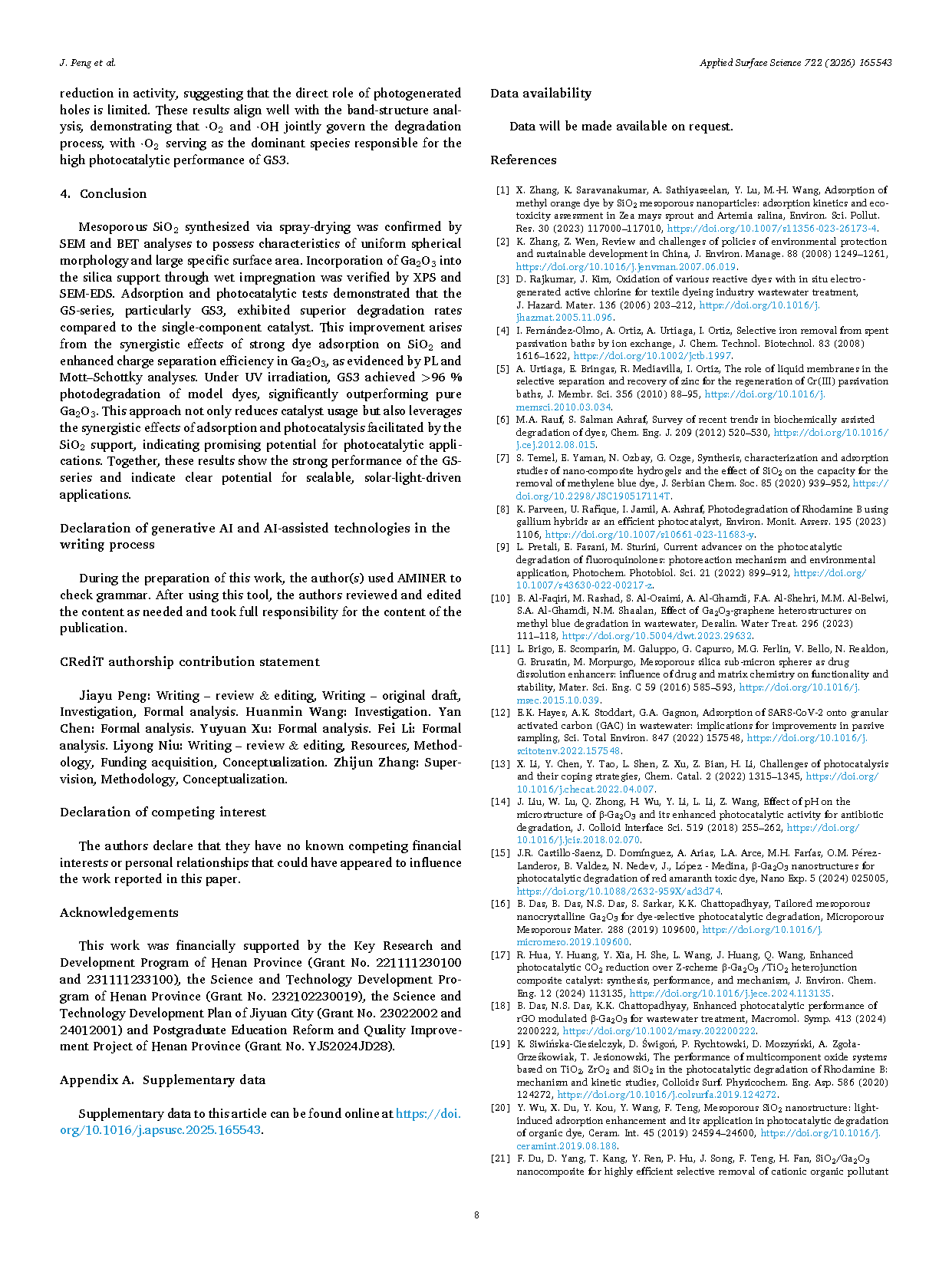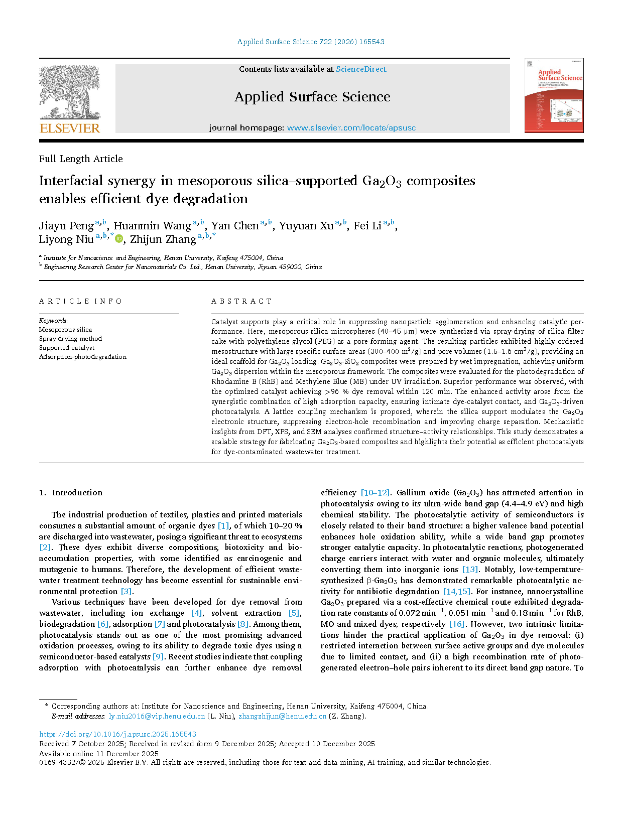 Researchers from the Henan University have published a dissertation titled "Interfacial synergy in mesoporous silica–supported Ga2O3 composites enables efficient dye degradation" in Applied Surface Science.