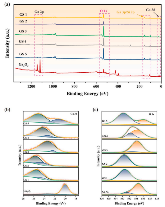 Fig. 3. XPS survey spectra of Ga2O3 (a) and corresponding high-resolution XPS spectra of Ga 3d (b), O 1s (c) for Ga2O3, GS1, GS2, GS3, GS4 and GS5.