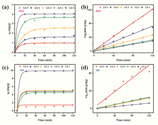 Fig. 5. Pseudo-first-order model and pseudo-second-order model of gs series samples for rhb dye (a and b) and mb dye (c and d) based on dark adsorption.