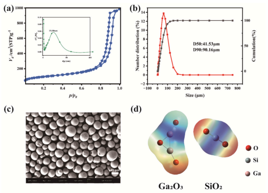 Fig. 1. Absorption and desorption curves and pore size distribution curves (a), particle size distribution of SiO2 (b), SEM images of silica (c), the optimized geometry and electrostatic potential map of the Ga2O3 and SiO2 (d).
