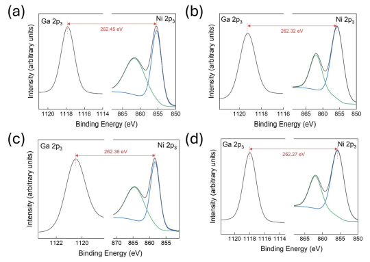 FIG. 3. XPS spectra of core levels for NiO/(AlxGa1−x)2O3 heterostructures with (a) x = 0, (b) x = 0.1, (c) x = 0.2, and (d) x = 0.3.