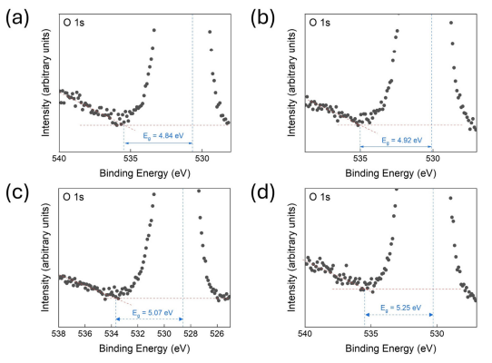 FIG. 2. Bandgaps of (a) Ga2O3, (b) (Al0.1Ga0.9)2O3, (c) (Al0.2Ga0.8)2O3, and (d) (Al0.3Ga0.7)2O3 determined using the onset of the plasmon loss feature in an O 1s photoemission spectrum. The intensities are in arbitrary units (a.u).