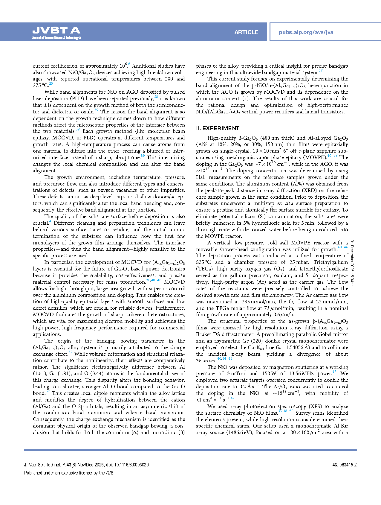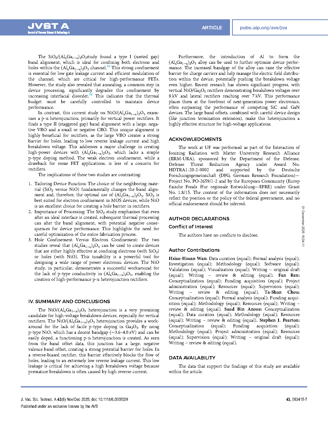 The NiO/(AlxGa1−x)2O3 heterojunction is a very promising candidate for high-voltage breakdown devices, especially for vertical rectifiers. The NiO/(AlxGa1−x)2O3 heterojunction provides a workaround for the lack of facile p-type doping in Ga2O3. By using p-type NiO, which has a decent bandgap (∼3.6–4.0 eV) and can be easily doped, a functioning p-n heterojunction is created. As seen from the band offset data, this junction has a large, negative valence band offset, creating a strong potential barrier for holes. In a reverse-biased rectifier, this barrier effectively blocks the flow of holes, leading to an extremely low reverse leakage current. This low leakage is critical for achieving a high breakdown voltage because premature breakdown is often caused by high reverse current.