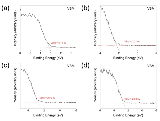 FIG. 1. XPS data to determine VBM in (a) Ga2O3, (b) (Al0.1Ga0.9)2O3, (c) (Al0.2Ga0.8)2O3, and (d) (Al0.3Ga0.7)2O3