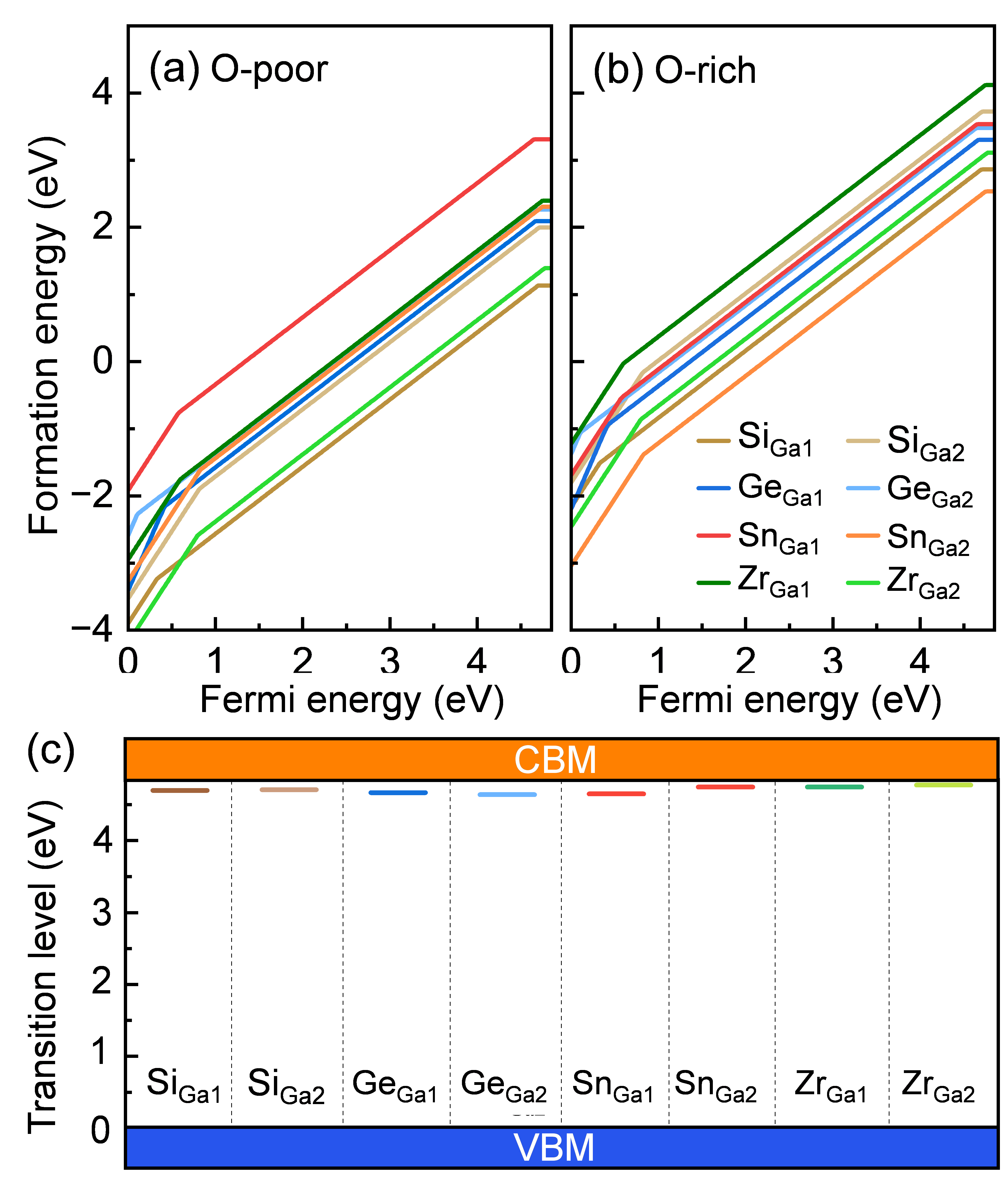 FIG. 1. Formation energies vs Fermi energy in Si, Ge, Sn, and Zr substituting Ga sites in β-Ga2O3 at (a) O-poor and (b) O-rich. (c) Transition level. Ga1 and Ga2 present a tetrahedral site and an octahedral site, respectively.