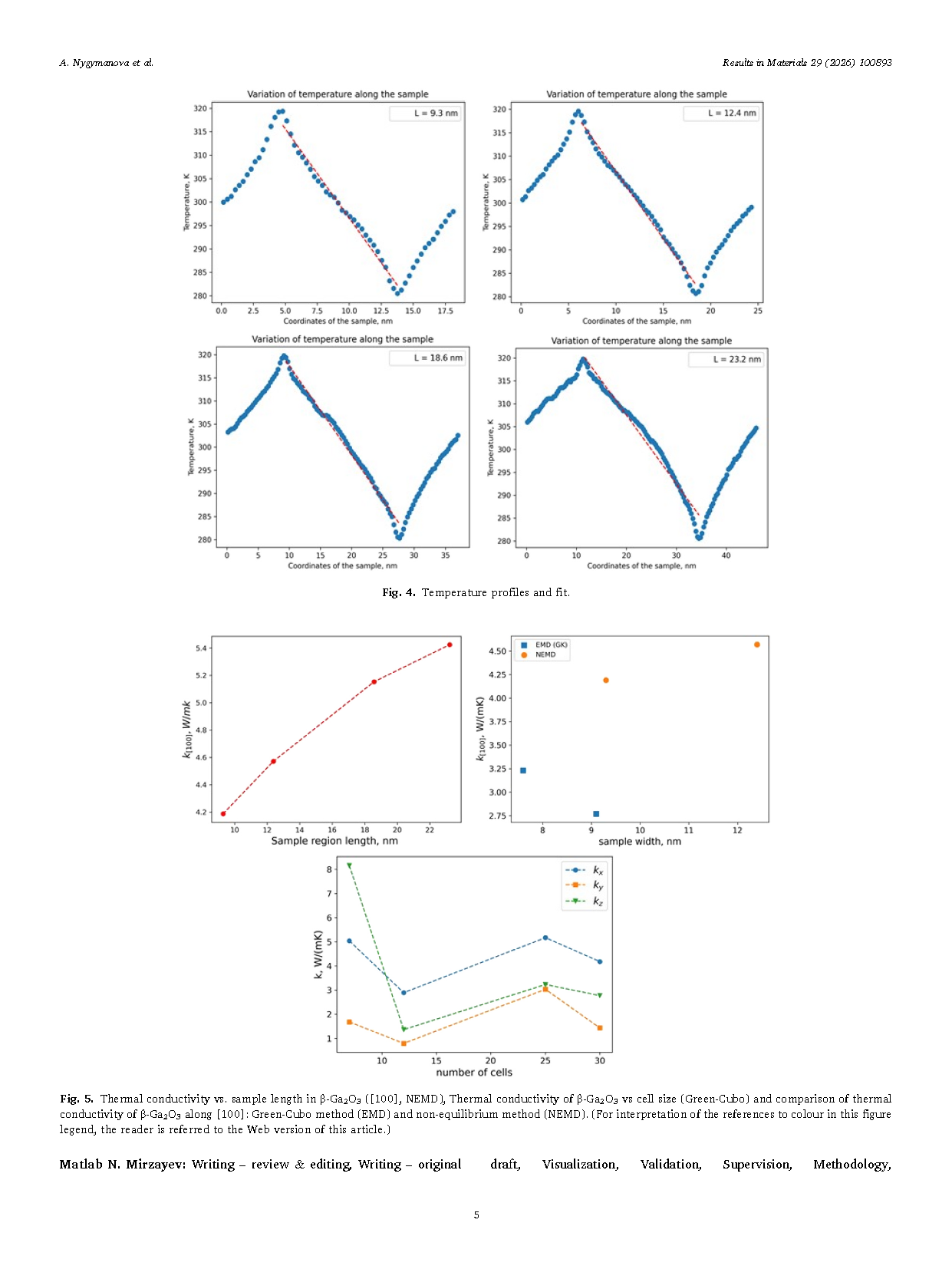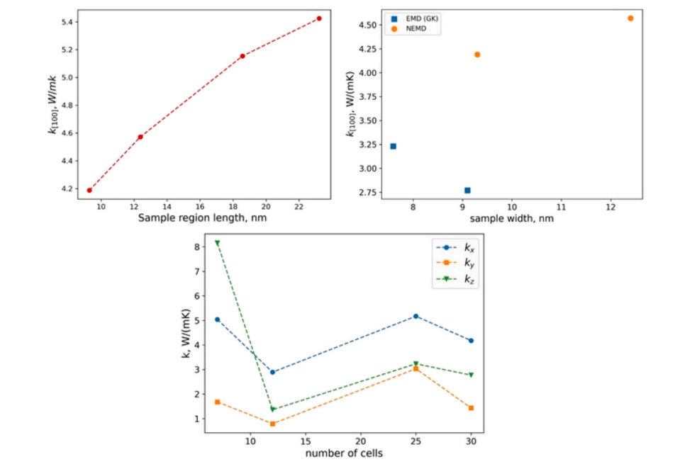 Fig. 5. Thermal conductivity vs. sample length in β-Ga2O3 ([100], NEMD), Thermal conductivity of β-Ga2O3 vs cell size (Green-Cubo) and comparison of thermal conductivity of β-Ga2O3 along [100]: Green-Cubo method (EMD) and non-equilibrium method (NEMD).