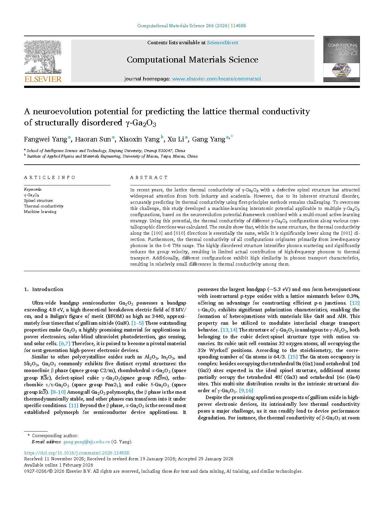 【Member Papers】A neuroevolution potential for predicting the lattice thermal conductivity of structurally disordered γ-Ga₂O₃